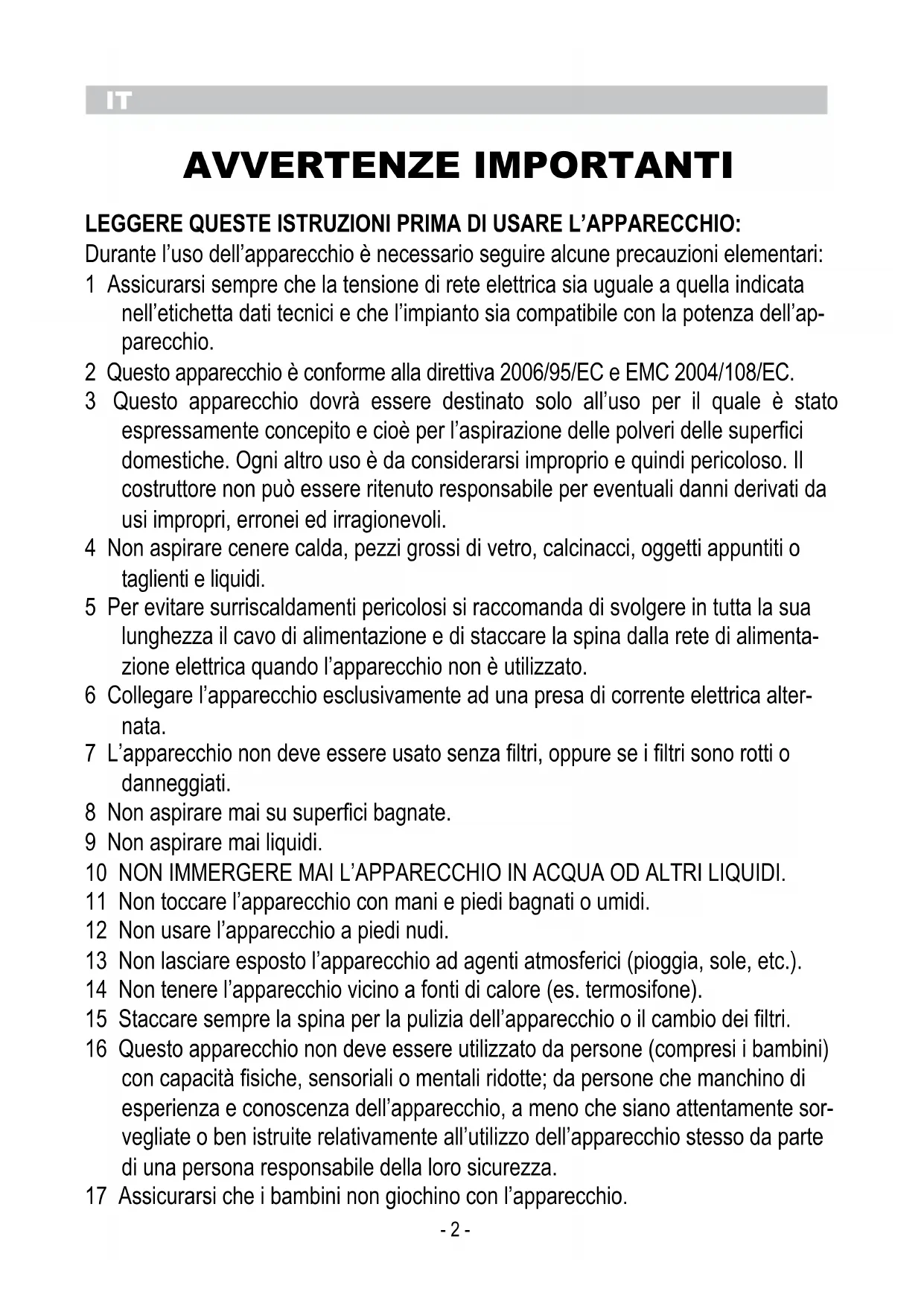 AVVERTENZE IMPORTANTI LEGGERE QUESTE ISTRUZIONI PRIMA DI USARE L’APPARECCHIO: Durante l’uso dell’apparecchio è necessario seguire alcune precauzioni elementari: 1 Assicurarsi sempre che la tensione di rete elettrica sia uguale a quella indicata nell’etichetta dati tecnici e che l’impianto sia compatibile con la potenza dell’ap- parecchio. 2 Questo apparecchio è conforme alla direttiva 2006/95/EC e EMC 2004/108/EC. 3 Questo apparecchio dovrà essere destinato solo all’uso per il quale è stato espressamente concepito e cioè per l’aspirazione delle polveri delle superci domestiche. Ogni altro uso è da considerarsi improprio e quindi pericoloso. Il costruttore non può essere ritenuto responsabile per eventuali danni derivati da usi impropri, erronei ed irragionevoli. 4 Non aspirare cenere calda, pezzi grossi di vetro, calcinacci, oggetti appuntiti o taglienti e liquidi. 5 Per evitare surriscaldamenti pericolosi si raccomanda di svolgere in tutta la sua lunghezza il cavo di alimentazione e di staccare la spina dalla rete di alimenta- zione elettrica quando l’apparecchio non è utilizzato. 6 Collegare l’apparecchio esclusivamente ad una presa di corrente elettrica alter- nata. 7 L’apparecchio non deve essere usato senza ltri, oppure se i ltri sono rotti o danneggiati. 8 Non aspirare mai su superci bagnate. 9 Non aspirare mai liquidi. 10 NON IMMERGERE MAI L’APPARECCHIO IN ACQUA OD ALTRI LIQUIDI. 11 Non toccare l’apparecchio con mani e piedi bagnati o umidi. 12 Non usare l’apparecchio a piedi nudi. 13 Non lasciare esposto l’apparecchio ad agenti atmosferici (pioggia, sole, etc.). 14 Non tenere l’apparecchio vicino a fonti di calore (es. termosifone). 15 Staccare sempre la spina per la pulizia dell’apparecchio o il cambio dei ltri. 16 Questo apparecchio non deve essere utilizzato da persone (compresi i bambini) con capacità siche, sensoriali o mentali ridotte; da persone che manchino di esperienza e conoscenza dell’apparecchio, a meno che siano attentamente sor- vegliate o ben istruite relativamente all’utilizzo dell’apparecchio stesso da parte di una persona responsabile della loro sicurezza. 17 Assicurarsi che i bambini non giochino con l’apparecchio.- 3 -