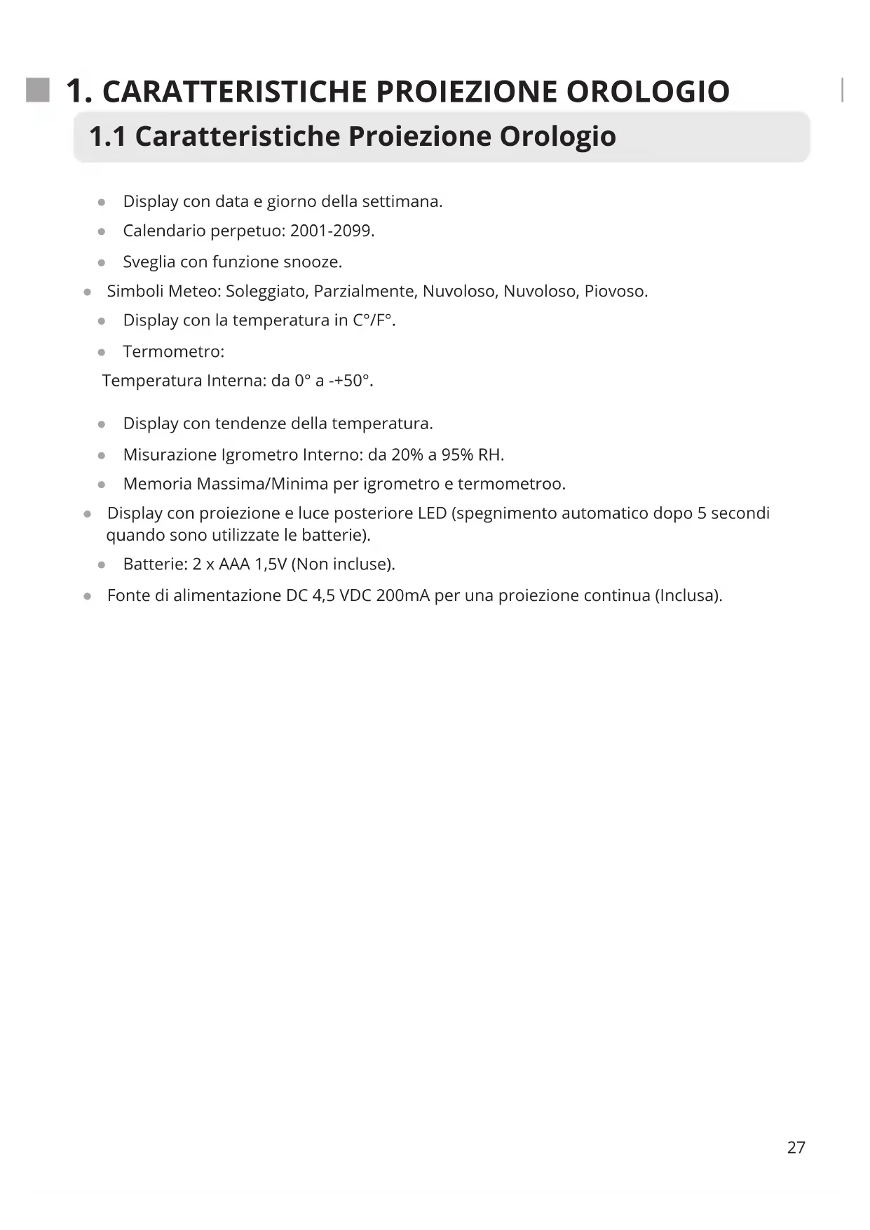 ● Display con data e giorno della settimana. ● Calendario perpetuo: 2001-2099. ● Sveglia con funzione snooze. ● Simboli Meteo: Soleggiato, Parzialmente, Nuvoloso, Nuvoloso, Piovoso. ● Display con la temperatura in C°/F°. ● Termometro: Temperatura Interna: da 0° a -+50°. ● Display con tendenze della temperatura. ● Misurazione Igrometro Interno: da 20% a 95% RH. ● Memoria Massima/Minima per igrometro e termometroo. ● Display con proiezione e luce posteriore LED (spegnimento automatico dopo 5 secondi quando sono utilizzate le batterie). ● Batterie: 2 x AAA 1,5V (Non incluse). ● Fonte di alimentazione DC 4,5 VDC 200mA per una proiezione continua (Inclusa).2. INFORMAZIONI IMPORTANTI