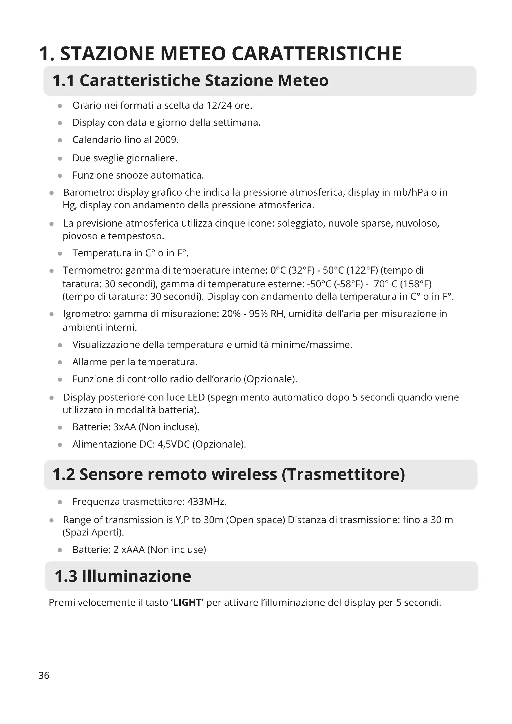 ● Orario nei formati a scelta da 12/24 ore. ● Display con data e giorno della settimana. ● Calendario no al 2009. ● Due sveglie giornaliere. ● Funzione snooze automatica. ● Barometro: display graco che indica la pressione atmosferica, display in mb/hPa o in Hg, display con andamento della pressione atmosferica. ● La previsione atmosferica utilizza cinque icone: soleggiato, nuvole sparse, nuvoloso, piovoso e tempestoso. ● Temperatura in C° o in F°. ● Termometro: gamma di temperature interne: 0°C (32°F) - 50°C (122°F) (tempo di taratura: 30 secondi), gamma di temperature esterne: -50°C (-58°F) - 70° C (158°F) (tempo di taratura: 30 secondi). Display con andamento della temperatura in C° o in F°. ● Igrometro: gamma di misurazione: 20% - 95% RH, umidità dell’aria per misurazione in ambienti interni. ● Visualizzazione della temperatura e umidità minime/massime. ● Allarme per la temperatura. ● Funzione di controllo radio dell’orario (Opzionale). ● Display posteriore con luce LED (spegnimento automatico dopo 5 secondi quando viene utilizzato in modalità batteria). ● Batterie: 3xAA (Non incluse). ● Alimentazione DC: 4,5VDC (Opzionale).