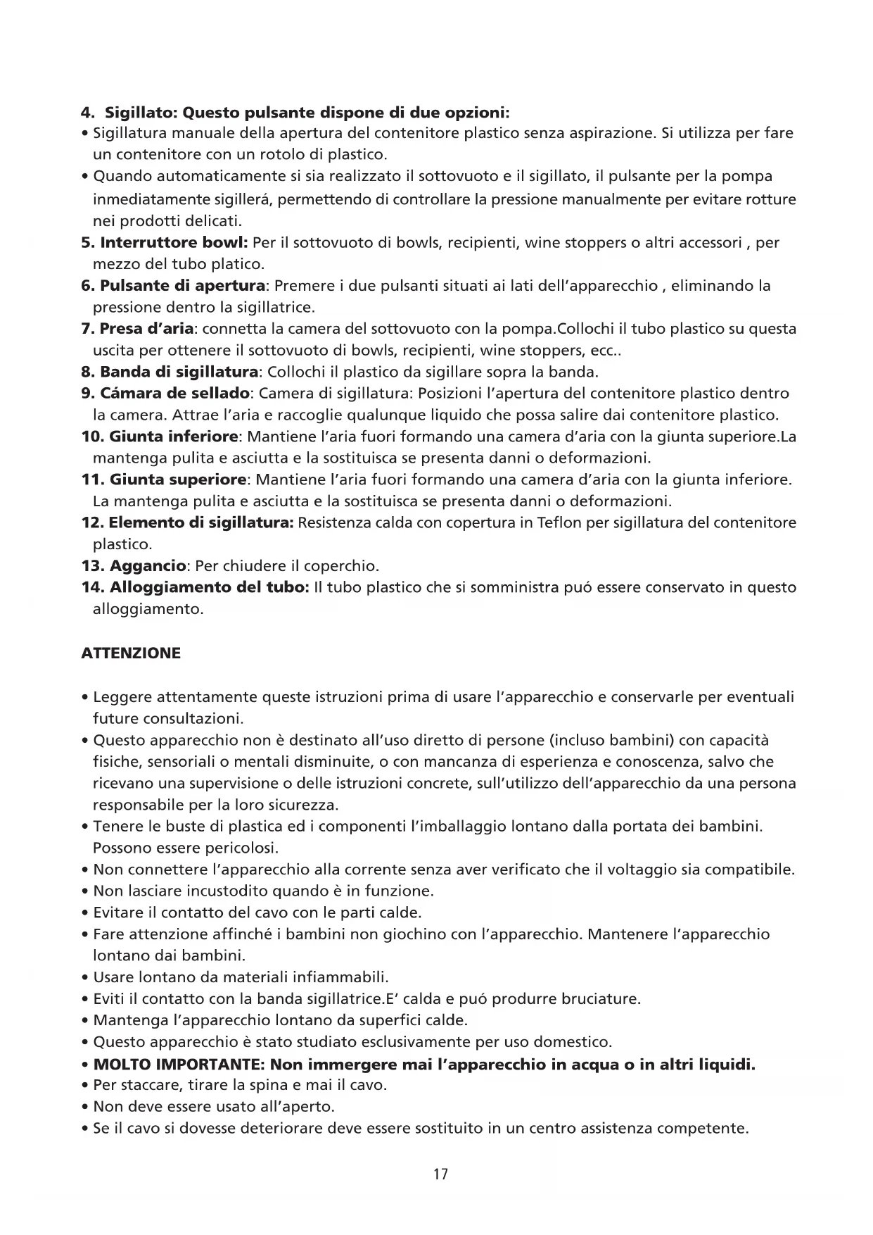 - Non realizzi la funzione sigillatrice continuamente per evitare che la macchina si surriscaldi.L’apparecchio rifiuterá la funzione se il pulsante “sigillare” é riattivato 15 secondi dopo l’ultima funzione.