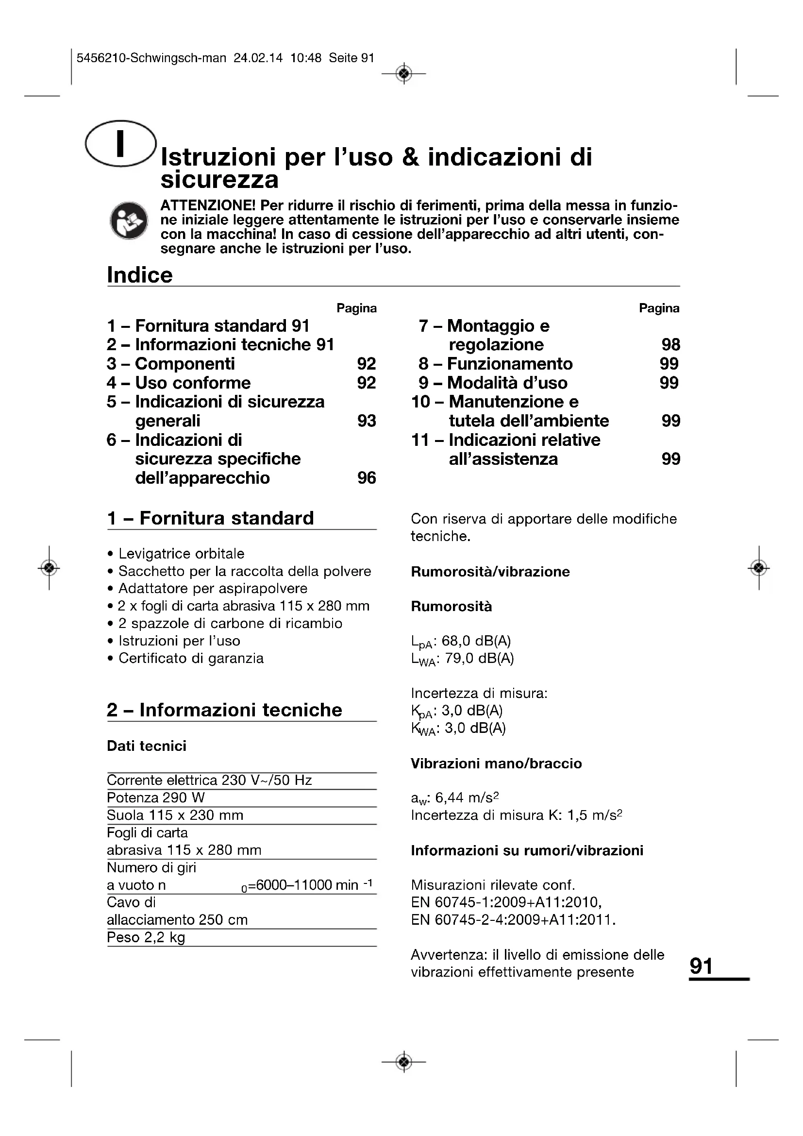 | 5 - Indicazioni di sicurezza generali | 93 | 10 - Manutenzione e tutela dell'ambiente | 99 |