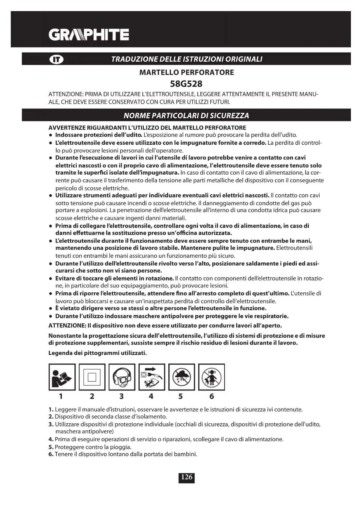 AVVERTENZE RIGUARDANTI L’UTILIZZO DEL MARTELLO PERFORATORE ● Indossare protezioni dell’udito. L’esposizione al rumore può provocare la perdita dell’udito. ● L’elettroutensile deve essere utilizzato con le impugnature fornite a corredo. La perdita di control- lo può provocare lesioni personali dell’operatore. ● Durante l’esecuzione di lavori in cui l’utensile di lavoro potrebbe venire a contatto con cavi elettrici nascosti o con il proprio cavo di alimentazione, l’elettroutensile deve essere tenuto solo tramite le superci isolate dell’impugnatura. In caso di contatto con il cavo di alimentazione, la cor- rente può causare il trasferimento della tensione alle parti metalliche del dispositivo con il conseguente pericolo di scosse elettriche. ● Utilizzare strumenti adeguati per individuare eventuali cavi elettrici nascosti. Il contatto con cavi sotto tensione può causare incendi o scosse elettriche. Il danneggiamento di condotte del gas può portare a esplosioni. La penetrazione dell’elettroutensile all’interno di una condotta idrica può causare scosse elettriche e causare ingenti danni materiali. ● Prima di collegare l’elettroutensile, controllare ogni volta il cavo di alimentazione, in caso di danni eettuarne la sostituzione presso un’ocina autorizzata. ● L’elettroutensile durante il funzionamento deve essere sempre tenuto con entrambe le mani, mantenendo una posizione di lavoro stabile. Mantenere pulite le impugnature. Elettroutensili tenuti con entrambi le mani assicurano un funzionamento più sicuro. ● Durante l’utilizzo dell’elettroutensile rivolto verso l’alto, posizionare saldamente i piedi ed assi- curarsi che sotto non vi siano persone. ● Evitare di toccare gli elementi in rotazione. Il contatto con componenti dell’elettroutensile in rotazio- ne, in particolare del suo equipaggiamento, può provocare lesioni. ● Prima di riporre l’elettroutensile, attendere no all’arresto completo di quest’ultimo. L’utensile di lavoro può bloccarsi e causare un’inaspettata perdita di controllo dell’elettroutensile. ● È vietato dirigere verso se stessi o altre persone l’elettroutensile in funzione. ● Durante l’utilizzo indossare maschere antipolvere per proteggere le vie respiratorie. ATTENZIONE: Il dispositivo non deve essere utilizzato per condurre lavori all’aperto. Nonostante la progettazione sicura dell’elettroutensile, l’utilizzo di sistemi di protezione e di misure di protezione supplementari, sussiste sempre il rischio residuo di lesioni durante il lavoro. Legenda dei pittogrammi utilizzati.