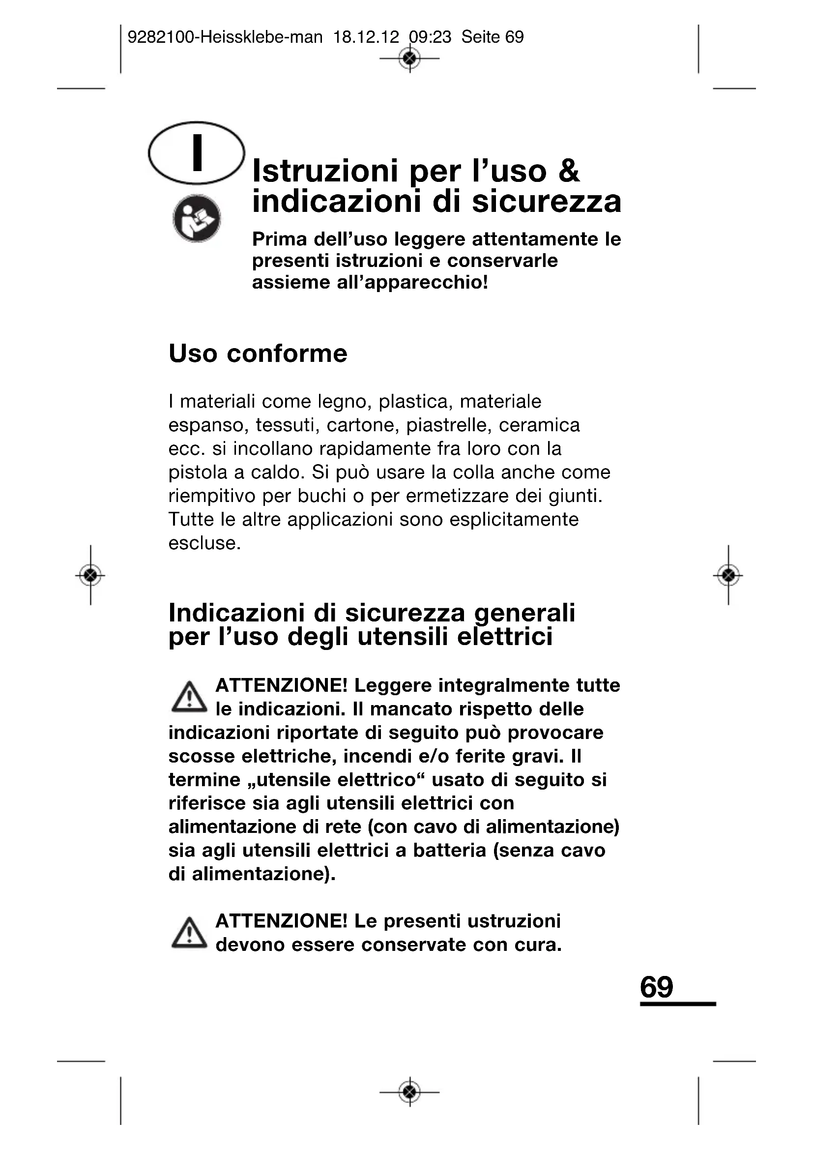 Colla e parti d'involucro caldi possono provocare delle usstioni. Evitate agli contatto con la pelle. Evitare assolutamente agli contatto con l'acqua e con sostanze contenti dei solventi! Impiegare solo i bastoncini di colla reperibili in commercio ad es. "Meister-Klebestift" n. 928110.