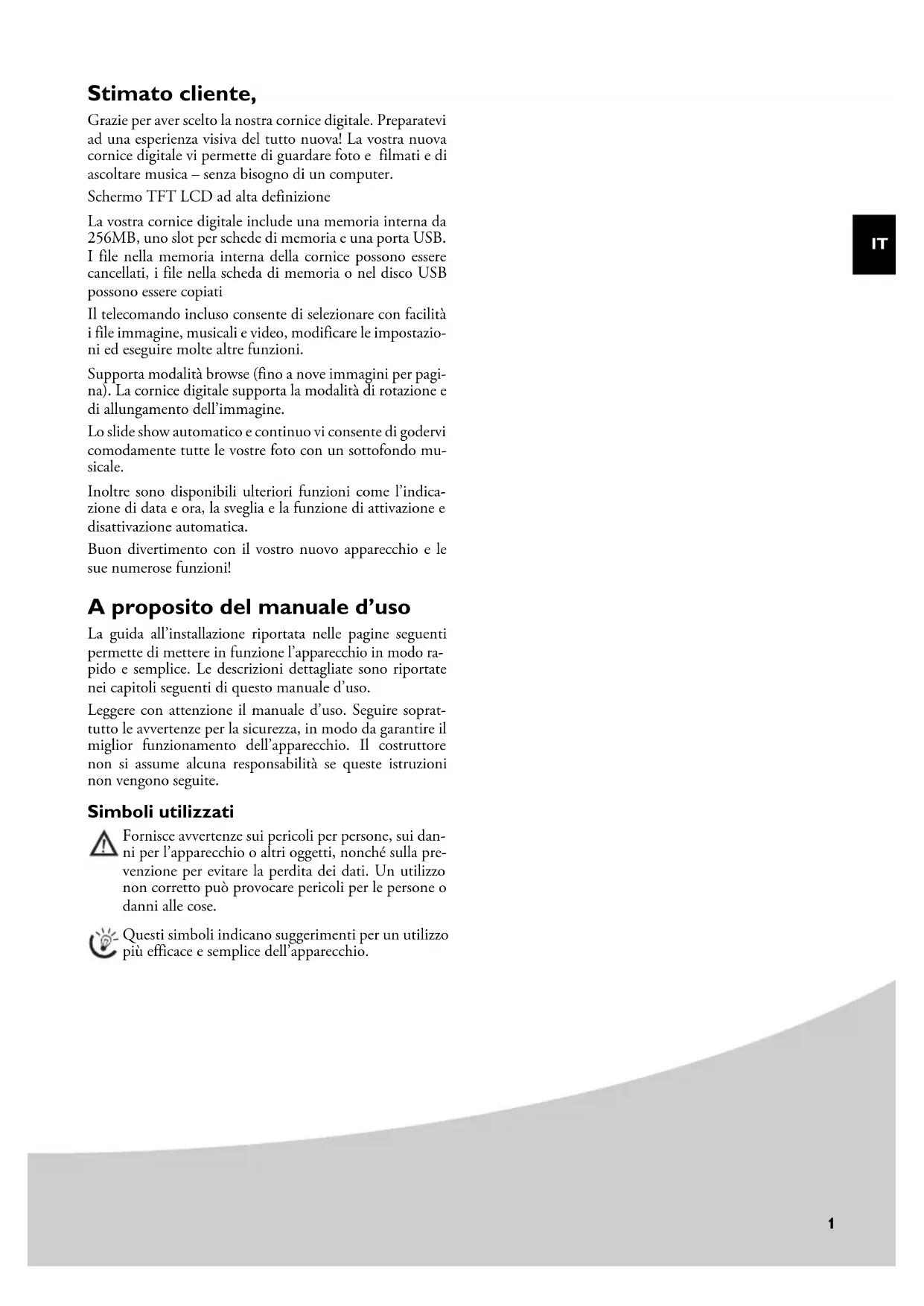Grazie per aver scelto la nostra cornice digitale. Preparatevi ad una esperienza visiva del tutto nuova! La nostra nuova cornice digitale vi permette di guardare fotoc filmati e di ascoltare musica -enza bisogno di un computer.