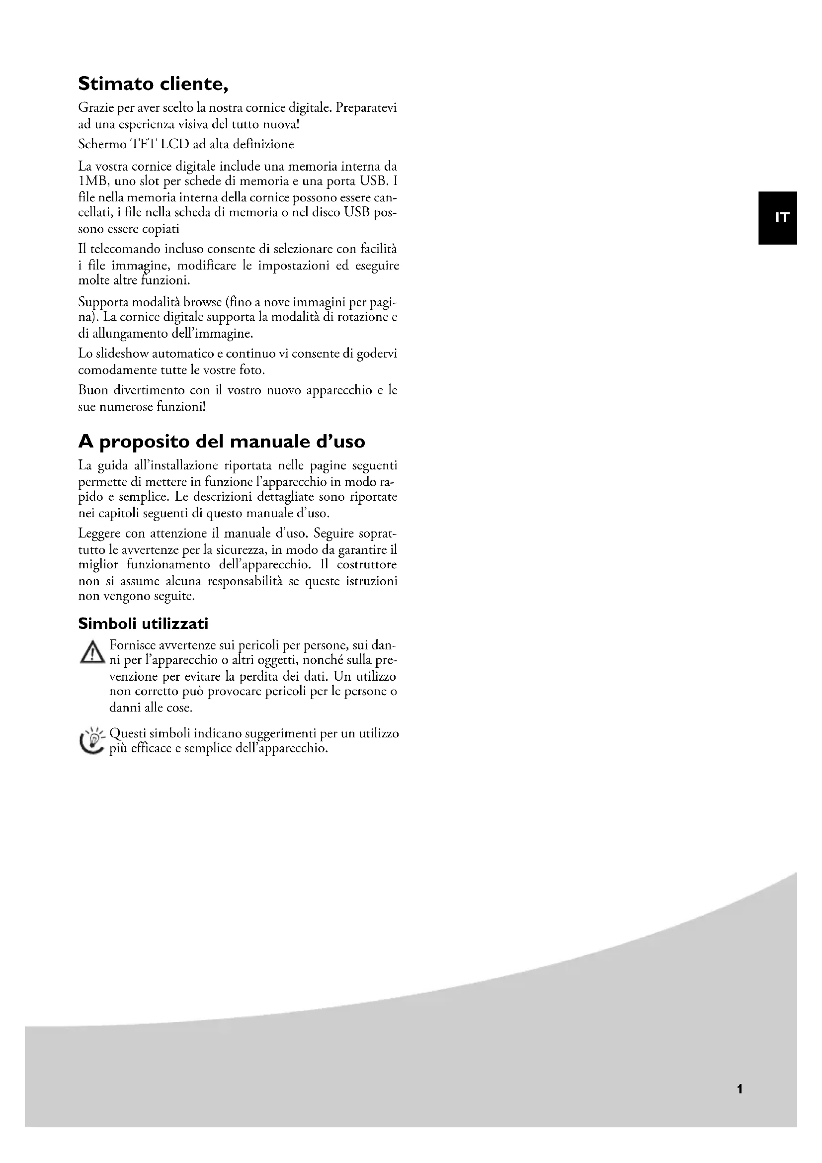 La vostra cornice digitale include una memoria interna da 1MB, uno slot per schede di memoria e una porta USB. I file nella memoria interna della cornice possono essere cancellati, i file nella scheda di memoria o nel disco USB sono essere copiati
