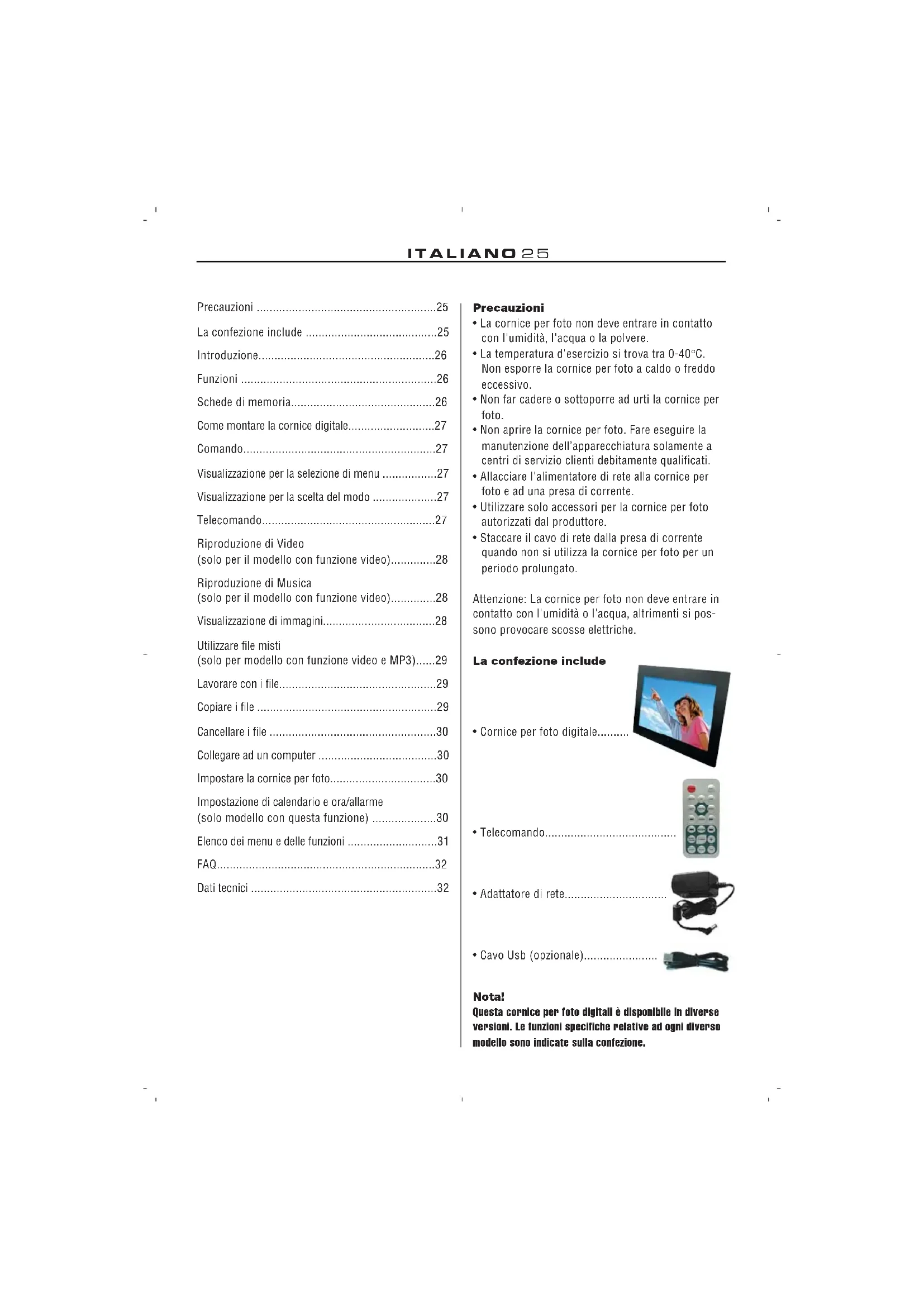 - Cavo Usb (opzionale)........................................... Nota! Questa cornice per foto digitali è disponibile in diverse versioni. Le funzioni specifiche relative ad ogni diverso modello sono indicate sulla confezione.ITALIANO26 Introduzione Congratulazioni per l'acquisto della vostra Digi- Frame! Con questo apparecchio potete ammirare le vostre foto digitali direttamente dalla scheda di memoria, il tutto senza computer. Basta inserire una scheda di memoria nella DigiFrame, accenderla e già si avvia lo slideshow con le vostre foto. Facile, no? Con la DigiFrame potete guardare singole immagi- ni, riprodurre videoclip o sottofondi musicali per slideshow (solo per modello con funzione video e MP3). Leggere attentamente le seguenti istruzioni per l'u- so onde imparare ad utilizzare al meglio le funzioni della vostra nuova DigiFrame. Nota! La DigFrame è disponibile in diverse versioni. Le funzioni specifiche relative ad ogni diverso modello di DigiFrame sono indicate sulla confezione. Funzioni