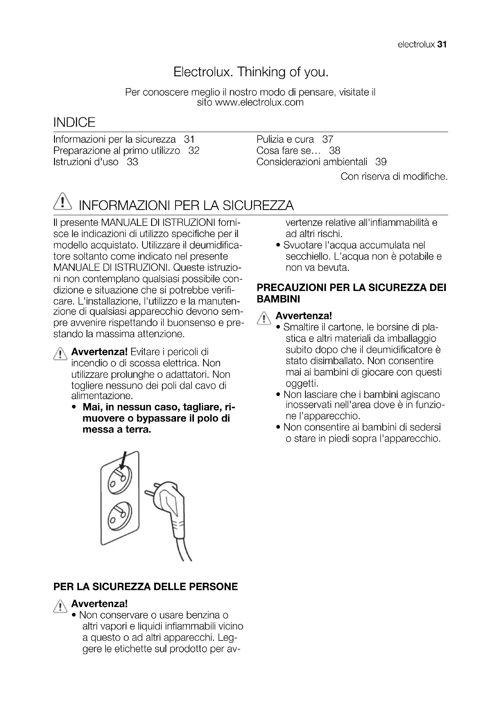 - Non consentire ai bambini di sedersi o stare in piedi sopra l'apparecchio. electrolux 31INFORMAZIONI ELETTRICHE Avvertenza!
