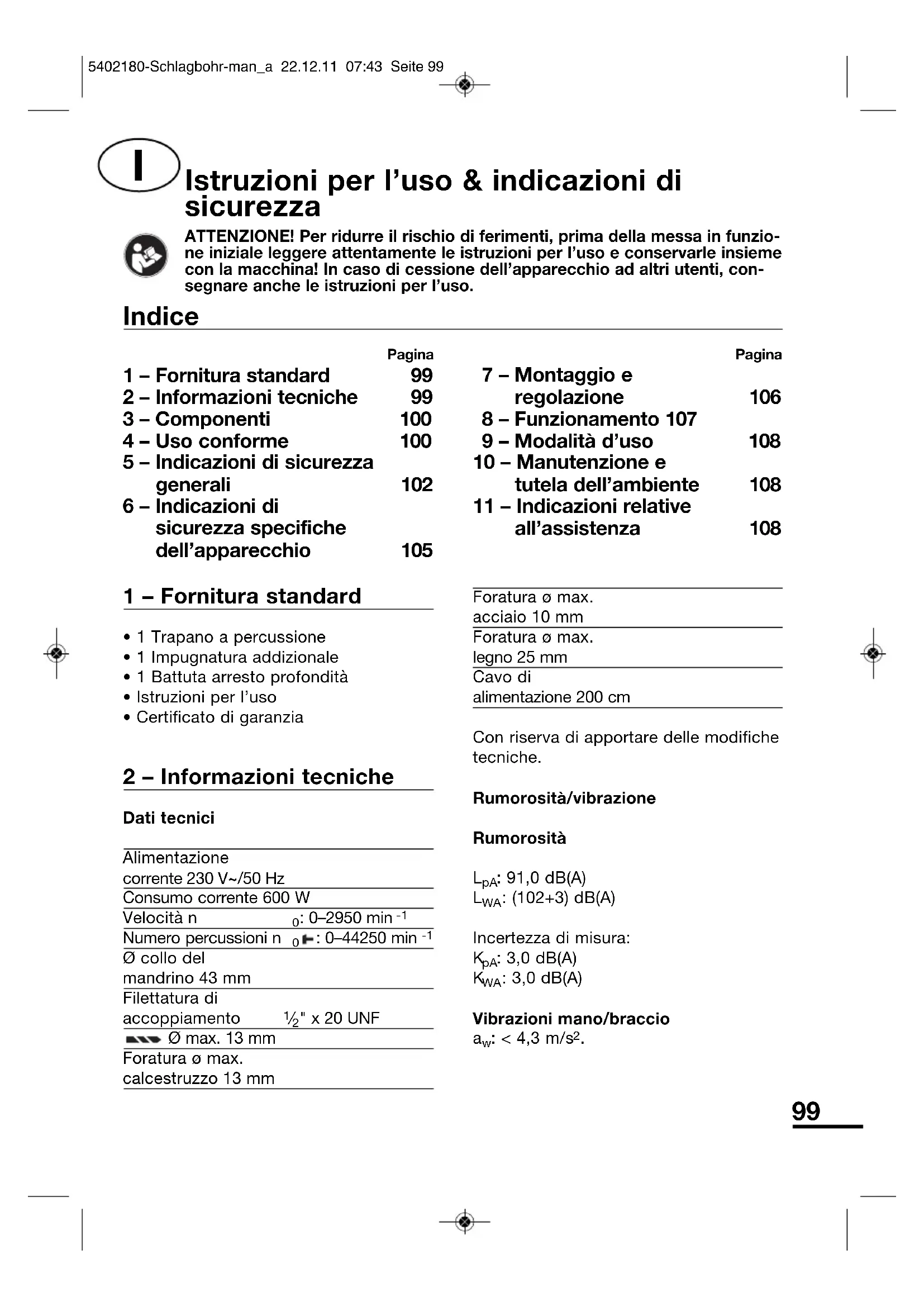 | Sicurezza | Indossare occhiali protettivi e guanti. Non utilizzare l'apparecchio in ambienti umidi. |