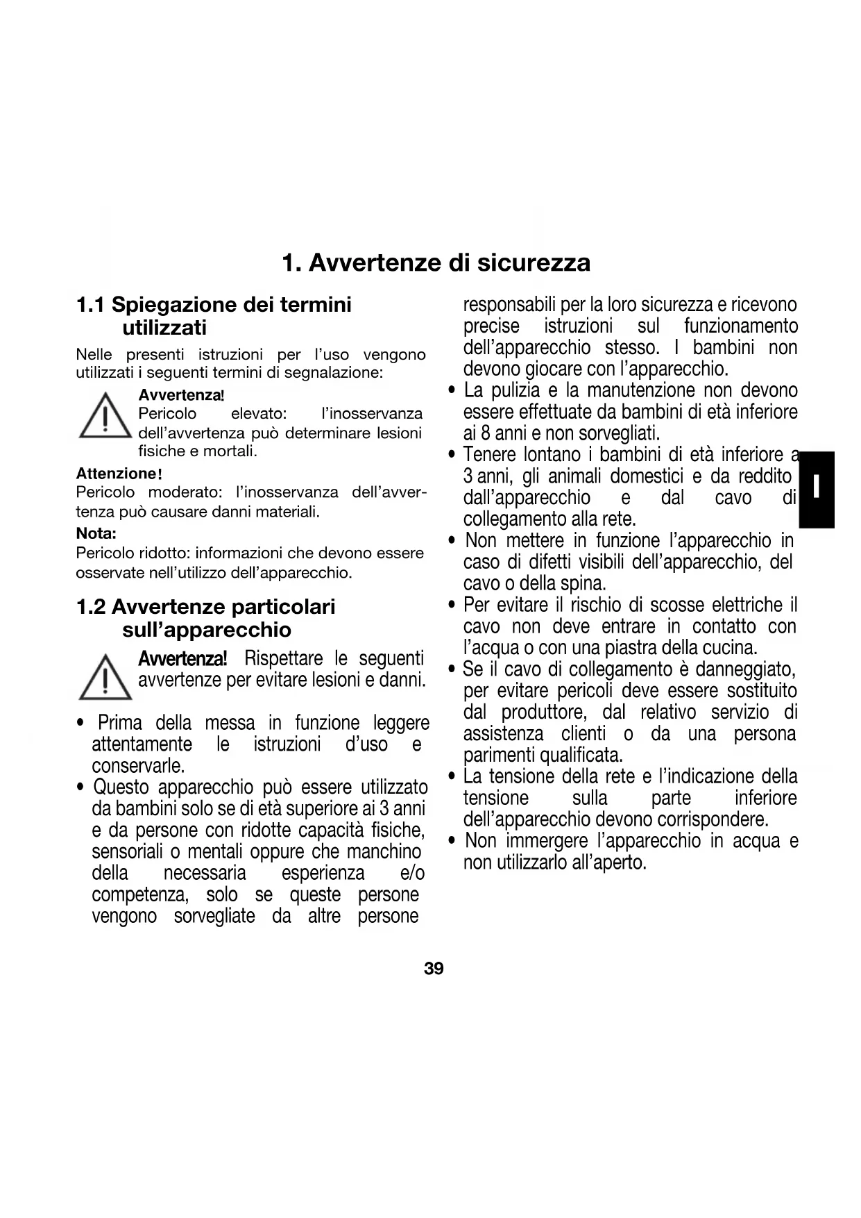 utilizzati Nelle presenti istruzioni per l’uso vengono utilizzati i seguenti termini di segnalazione: Avvertenza! Pericolo elevato: l’inosservanza dell’avvertenza può determinare lesioni fisiche e mortali. Attenzione! Pericolo moderato: l’inosservanza dell’avver- tenza può causare danni materiali. Nota: Pericolo ridotto: informazioni che devono essere osservate nell’utilizzo dell’apparecchio.