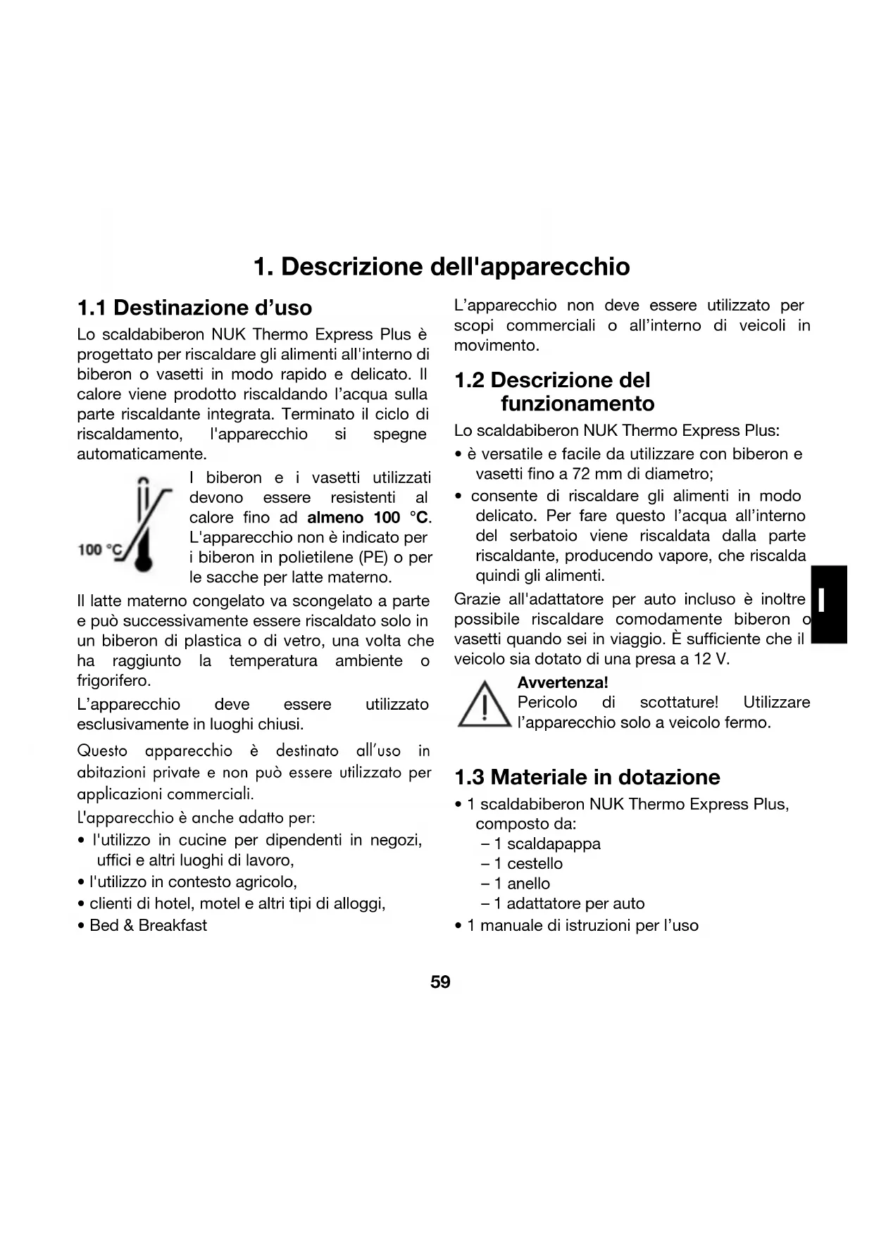 Lo scaldabiberon NUK Thermo Express Plus è progettato per riscaldare gli alimenti all'interno di biberon o vasetti in modo rapido e delicato. Il calore viene prodotto riscaldando l’acqua sulla parte riscaldante integrata. Terminato il ciclo di riscaldamento, l'apparecchio si spegne automaticamente. I biberon e i vasetti utilizzati devono essere resistenti al calore fino ad almeno 100 °C. L'apparecchio non è indicato per i biberon in polietilene (PE) o per le sacche per latte materno. Il latte materno congelato va scongelato a parte e può successivamente essere riscaldato solo in un biberon di plastica o di vetro, una volta che ha raggiunto la temperatura ambiente o frigorifero. L’apparecchio deve essere utilizzato esclusivamente in luoghi chiusi. Questo apparecchio è destinato all’uso in abitazioni private e non può essere utilizzato per applicazioni commerciali. L'apparecchio è anche adatto per: