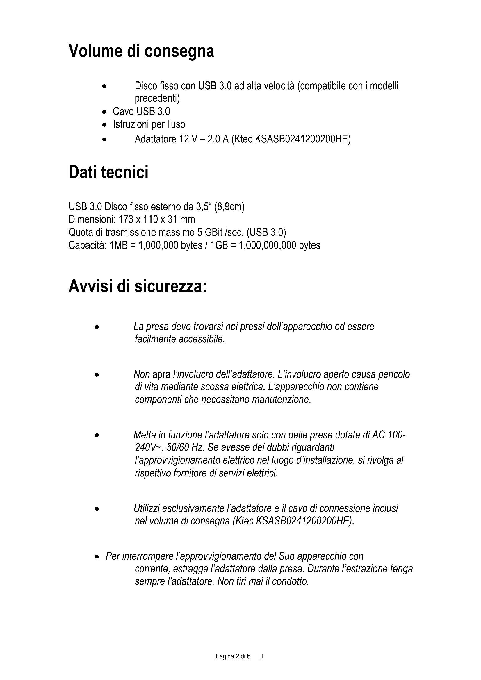 3,5“ MEMORYBOARDPagina 2 di 6 IT Volume di consegna Disco fisso con USB 3.0 ad alta velocità (compatibile con i modelli precedenti) Cavo USB 3.0 Istruzioni per l'uso Adattatore 12 V – 2.0 A (Ktec KSASB0241200200HE) Dati tecnici USB 3.0 Disco fisso esterno da 3,5“ (8,9cm) Dimensioni: 173 x 110 x 31 mm Quota di trasmissione massimo 5 GBit /sec. (USB 3.0) Capacità: 1MB = 1,000,000 bytes / 1GB = 1,000,000,000 bytes