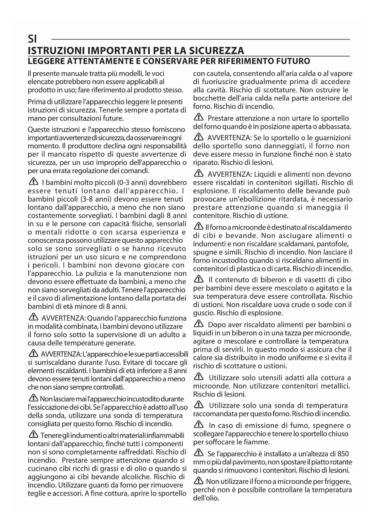 850 mmIl presente manuale tratta più modelli, le voci elencate potrebbero non essere applicabili al prodotto in uso; fare riferimento al prodotto stesso. Prima di utilizzare l'apparecchio leggere le presenti istruzioni di sicurezza. Tenerle sempre a portata di mano per consultazioni future. Queste istruzioni e l'apparecchio stesso forniscono importanti avvertenze di sicurezza, da osservare in ogni momento. Il produttore declina ogni responsabilità per il mancato rispetto di queste avvertenze di sicurezza, per un uso improprio dell'apparecchio o per una errata regolazione dei comandi. I bambini molto piccoli (0-3 anni) dovrebbero essere tenuti lontano dall'apparecchio. I bambini piccoli (3-8 anni) devono essere tenuti lontano dall'apparecchio, a meno che non siano costantemente sorvegliati. I bambini dagli 8 anni in su e le persone con capacità fisiche, sensoriali o mentali ridotte o con scarsa esperienza e conoscenza possono utilizzare questo apparecchio solo se sono sorvegliati o se hanno ricevuto istruzioni per un uso sicuro e ne comprendono i pericoli. I bambini non devono giocare con l'apparecchio. La pulizia e la manutenzione non devono essere effettuate da bambini, a meno che non siano sorvegliati da adulti. Tenere l'apparecchio e il cavo di alimentazione lontano dalla portata dei bambini di età minore di 8 anni. AVVERTENZA: Quando l'apparecchio funziona in modalità combinata, i bambini devono utilizzare il forno solo sotto la supervisione di un adulto a causa delle temperature generate. AVVERTENZA: L'apparecchio e le sue parti accessibili si surriscaldano durante l'uso. Evitare di toccare gli elementi riscaldanti. I bambini di età inferiore a 8 anni devono essere tenuti lontani dall’apparecchio a meno che non siano sempre controllati. Non lasciare mai l'apparecchio incustodito durante l'essiccazione dei cibi. Se l'apparecchio è adatto all'uso della sonda, utilizzare una sonda di temperatura consigliata per questo forno. Rischio di incendio. Tenere gli indumenti o altri materiali infiammabili lontani dall'apparecchio, finché tutti i componenti non si sono completamente raffreddati. Rischio di incendio. Prestare sempre attenzione quando si cucinano cibi ricchi di grassi e di olio o quando si aggiungono ai cibi bevande alcoliche. Rischio di incendio. Utilizzare guanti da forno per rimuovere teglie e accessori. A fine cottura, aprire lo sportello