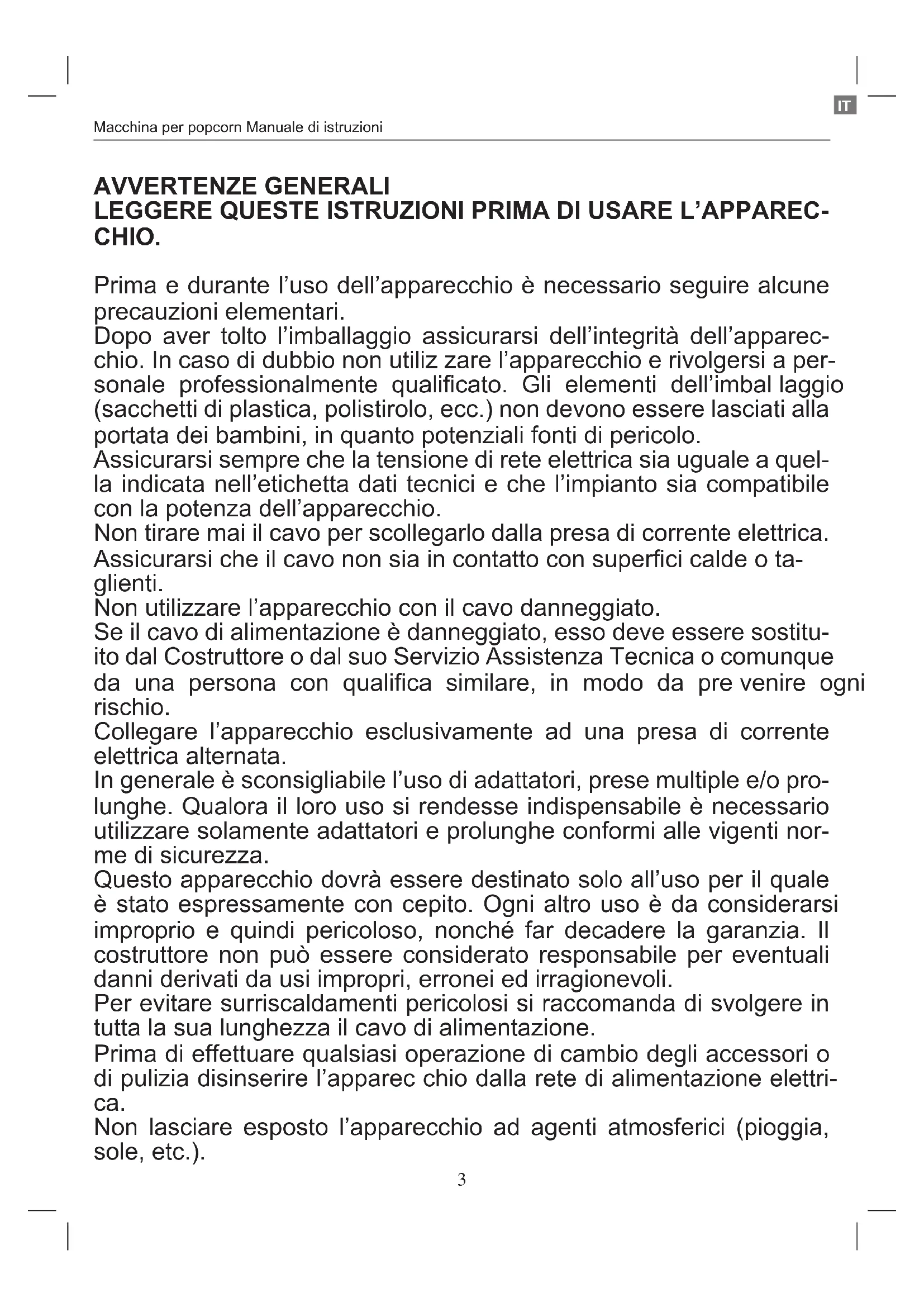 Non lasciare il cavo di alimentazione inutilmente inserito nella presa di corrente, scollegarlo sempre quando non si utilizza la macchina per popcorn.