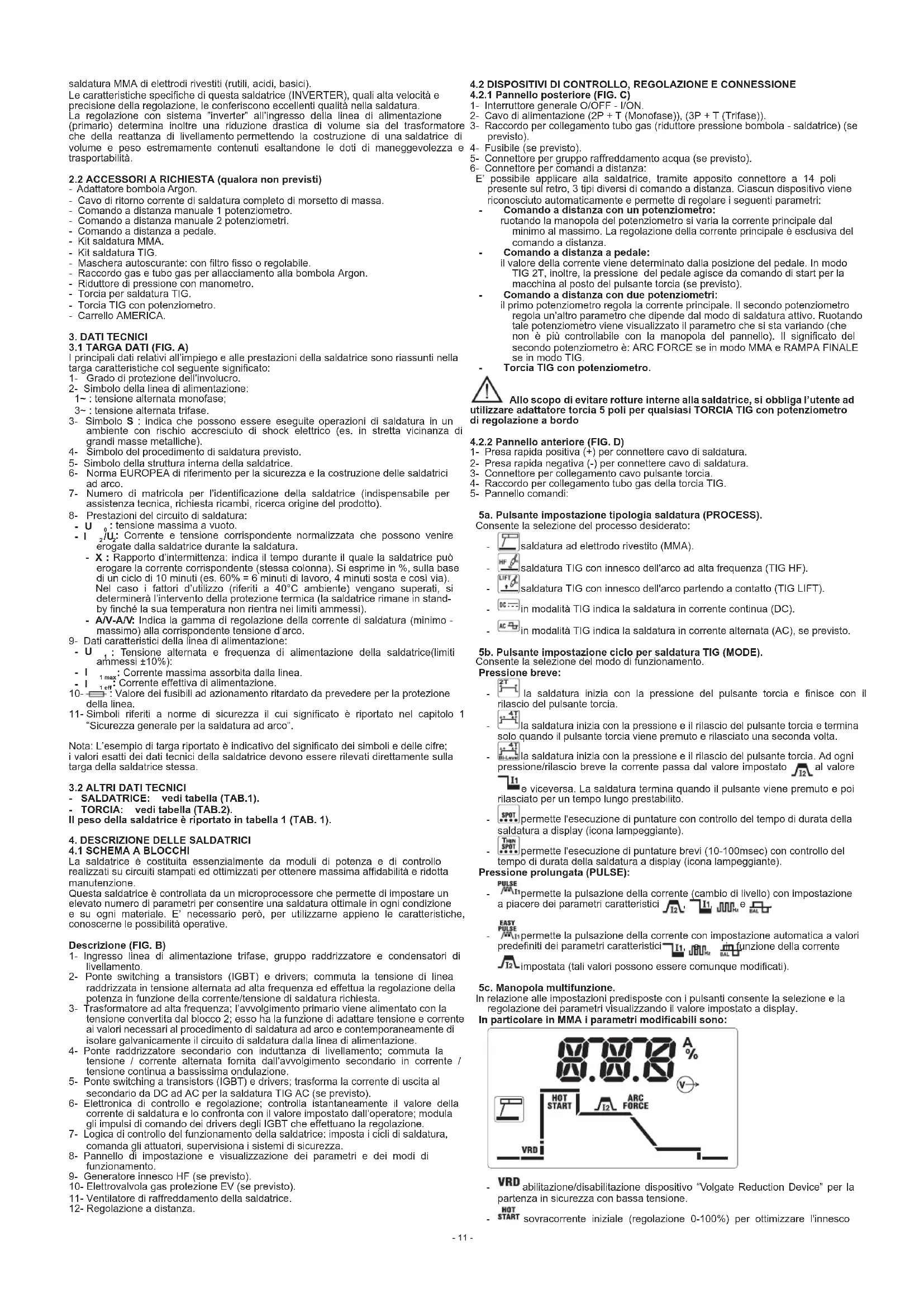 8.RICERCAGUASTI...............................................................................................14 pag. pag.- 11 - saldatura MMA di elettrodi rivestiti (rutili, acidi, basici). Le caratteristiche speciche di questa saldatrice (INVERTER), quali alta velocità e precisione della regolazione, le conferiscono eccellenti qualità nella saldatura. La regolazione con sistema ”inverter” all’ingresso della linea di alimentazione (primario) determina inoltre una riduzione drastica di volume sia del trasformatore che della reattanza di livellamento permettendo la costruzione di una saldatrice di volume e peso estremamente contenuti esaltandone le doti di maneggevolezza e trasportabilità. 2.2ACCESSORIARICHIESTA(qualoranonprevisti) - Adattatore bombola Argon. - Cavo di ritorno corrente di saldatura completo di morsetto di massa. - Comando a distanza manuale 1 potenziometro. - Comando a distanza manuale 2 potenziometri. - Comando a distanza a pedale. - Kit saldatura MMA. - Kit saldatura TIG. - Maschera autoscurante: con ltro sso o regolabile. - Raccordo gas e tubo gas per allacciamento alla bombola Argon. - Riduttore di pressione con manometro. - Torcia per saldatura TIG. - Torcia TIG con potenziometro. - Carrello AMERICA. 3.DATITECNICI 3.1TARGADATI(FIG.A) I principali dati relativi all’impiego e alle prestazioni della saldatrice sono riassunti nella targa caratteristiche col seguente signicato: