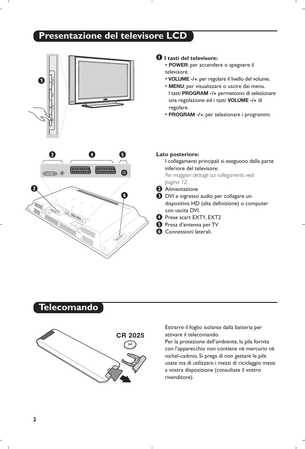 Les raccordements principaux s’effectuent par le dessous du téléviseur. Pour plus de détails sur les raccordements, voir page 12. é Alimentation “ Prise DVI et entrée audio pour le raccordement d’un appareil HD (Haute Définition) ou d’un ordinateur avec sortie DVI ‘ Prises péritel EXT 1 et EXT 2 ( Prise d’antenne TV Les touches de la télécommande 1)
