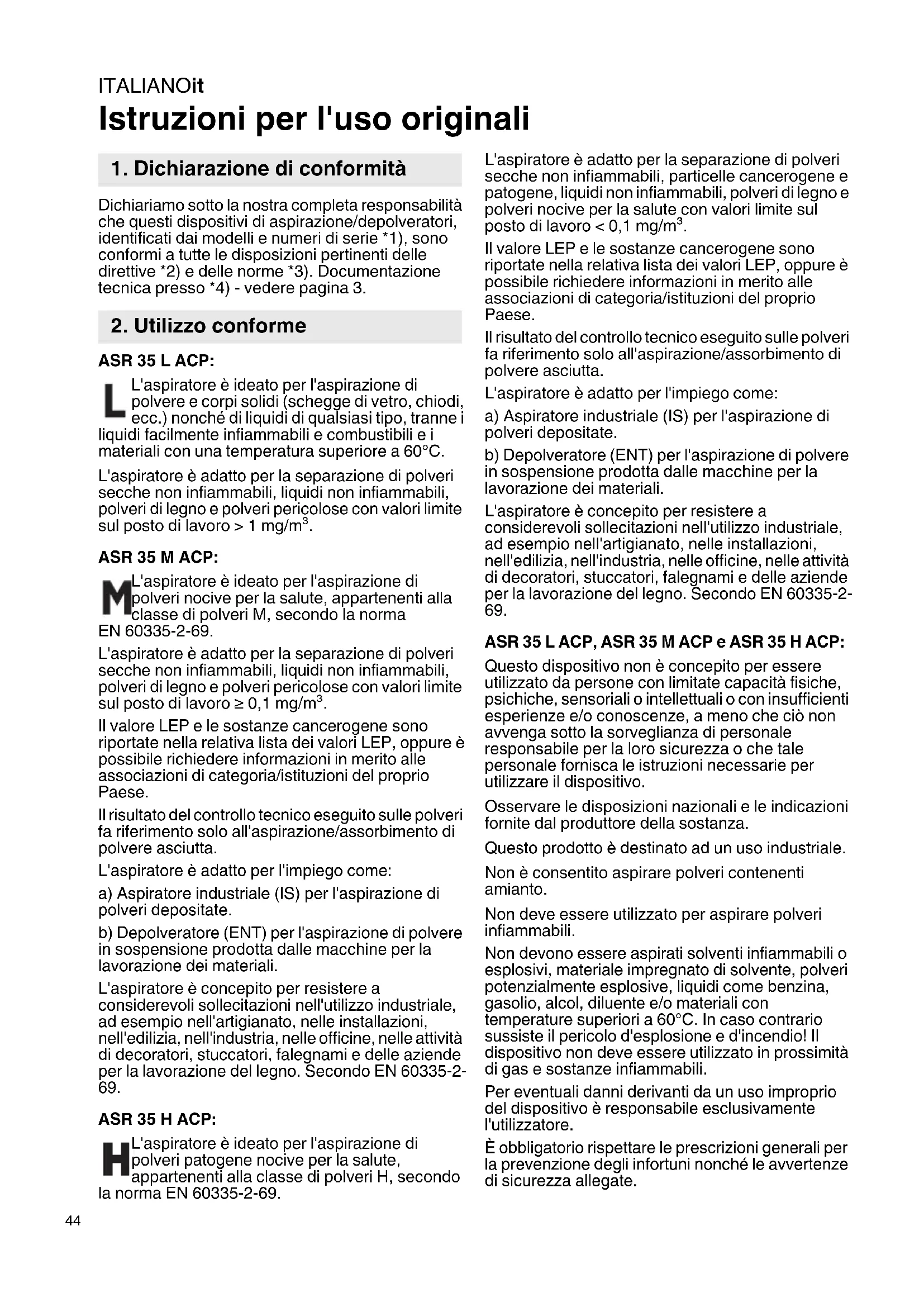 Istruzioni per l'uso originali Dichiariamo sotto la nostra completa responsabilità che questi dispositivi di aspirazione/depolveratori, identificati dai modelli e numeri di serie *1), sono conformi a tutte le disposizioni pertinenti delle direttive *2) e delle norme *3). Documentazione tecnica presso *4) - vedere pagina 3. ASR 35 L ACP: L'aspiratore è ideato per l'aspirazione di polvere e corpi solidi (schegge di vetro, chiodi, ecc.) nonché di liquidi di qualsiasi tipo, tranne i liquidi facilmente infiammabili e combustibili e i materiali con una temperatura superiore a 60°C. L'aspiratore è adatto per la separazione di polveri secche non infiammabili, liquidi non infiammabili, polveri di legno e polveri pericolose con valori limite sul posto di lavoro > 1 mg/m³. ASR 35 M ACP: L'aspiratore è ideato per l'aspirazione di polveri nocive per la salute, appartenenti alla classe di polveri M, secondo la norma EN 60335-2-69. L'aspiratore è adatto per la separazione di polveri secche non infiammabili, liquidi non infiammabili, polveri di legno e polveri pericolose con valori limite sul posto di lavoro ≥ 0,1 mg/m³. Il valore LEP e le sostanze cancerogene sono riportate nella relativa lista dei valori LEP, oppure è possibile richiedere informazioni in merito alle associazioni di categoria/istituzioni del proprio Paese. Il risultato del controllo tecnico eseguito sulle polveri fa riferimento solo all'aspirazione/assorbimento di polvere asciutta. L'aspiratore è adatto per l'impiego come: a) Aspiratore industriale (IS) per l'aspirazione di polveri depositate. b) Depolveratore (ENT) per l'aspirazione di polvere in sospensione prodotta dalle macchine per la lavorazione dei materiali. L'aspiratore è concepito per resistere a considerevoli sollecitazioni nell'utilizzo industriale, ad esempio nell'artigianato, nelle installazioni, nell'edilizia, nell'industria, nelle officine, nelle attività di decoratori, stuccatori, falegnami e delle aziende per la lavorazione del legno. Secondo EN 60335-2-