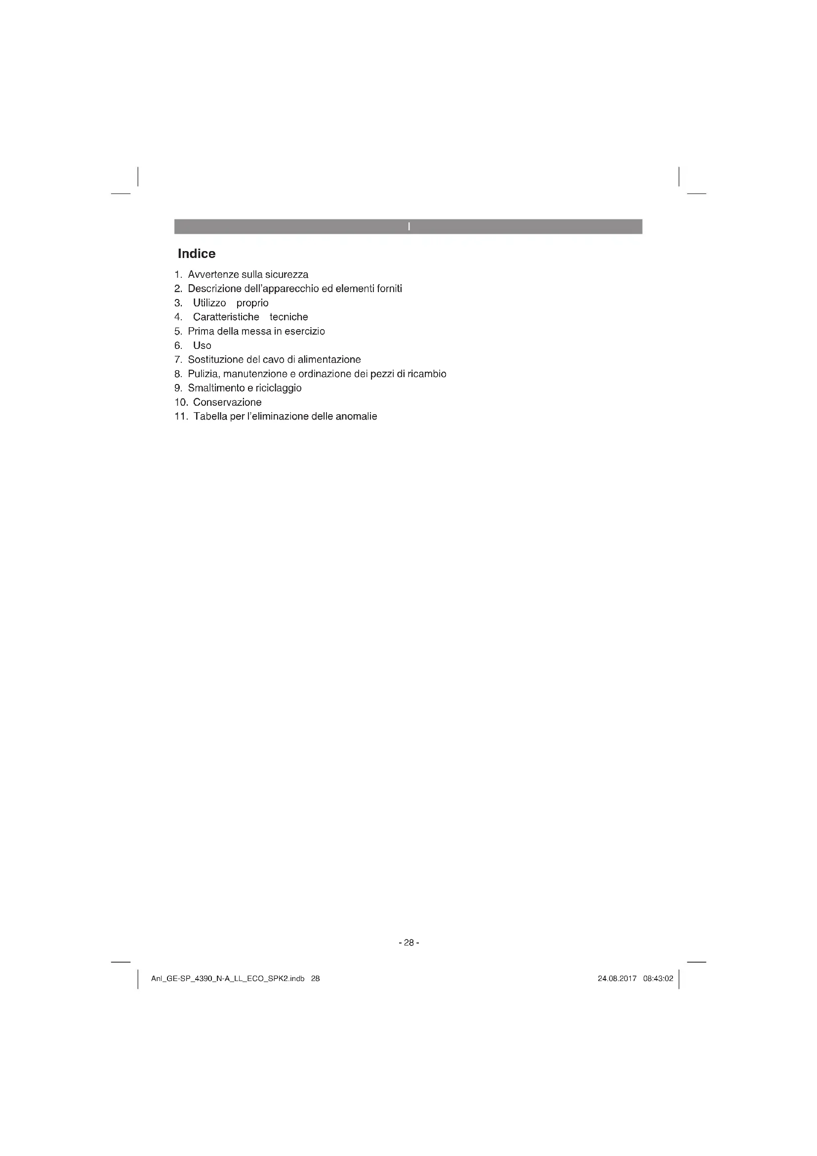 Questo apparecchio può essere usato da bambini a partire dagli 8 anni e da persone con capacità fi siche, sensoriali o mentali ridotte o prive di esperienza e conoscenze solo se vengono sorvegliati o sono stati istruiti riguardo l‘uso sicuro dell‘apparecchio e conoscono i rischi ad esso connessi. I bambini non devono giocare con l‘apparecchio. Le operazioni di pulizia e di manutenzione a carico dell‘utilizzatore non devono venire eseguite dai bambini se non sono sorvegliati. Se il cavo di alimentazione di questo apparecchio viene danneggiato deve essere sostituito dal produttore, dal suo servizio di assistenza clienti o da una persona al pari qualifi cata al fi ne di evitare pericoli. Pericolo! - Per ridurre il rischio di lesioni leggete le istruzioni per l’uso Anl_GE-SP_4390_N-A_LL_ECO_SPK2.indb 29Anl_GE-SP_4390_N-A_LL_ECO_SPK2.indb 29 24.08.2017 08:43:0324.08.2017 08:43:03I