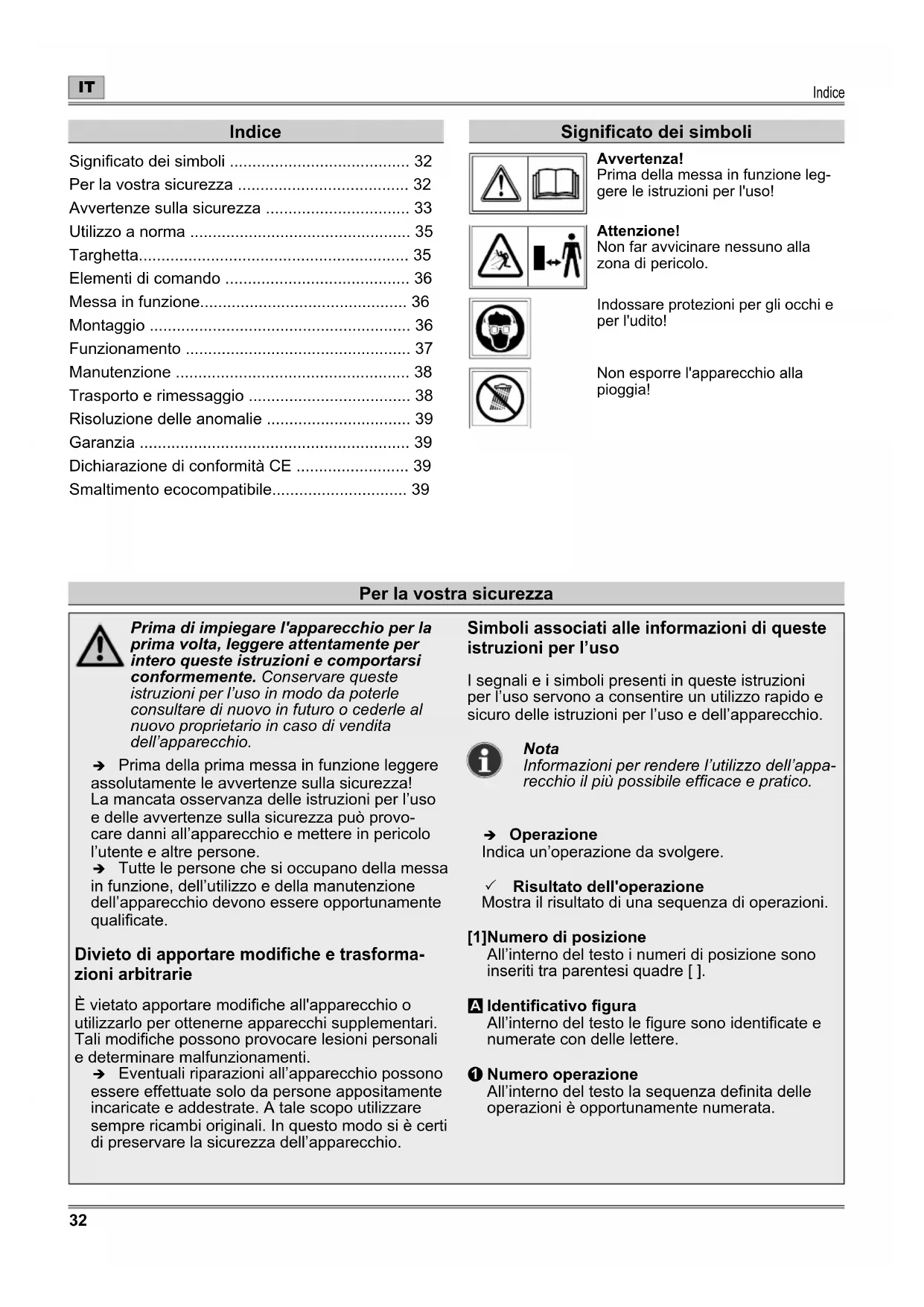 Prima di impiegare l'apparecchio per la prima volta, leggere attentamente per intero queste istruzioni e comportarsi conformemente. Conservare queste istruzioni per l’uso in modo da poterle consultare di nuovo in futuro o cederle al nuovo proprietario in caso di vendita dell’apparecchio. Î Prima della prima messa in funzione leggere assolutamente le avvertenze sulla sicurezza! La mancata osservanza delle istruzioni per l’uso e delle avvertenze sulla sicurezza può provo- care danni all’apparecchio e mettere in pericolo l’utente e altre persone. Î Tutte le persone che si occupano della messa in funzione, dell’utilizzo e della manutenzione dell’apparecchio devono essere opportunamente qualicate. Divieto di apportare modifiche e trasforma- zioni arbitrarie Èvietatoapportaremodicheall'apparecchioo utilizzarlo per ottenerne apparecchi supplementari. Talimodichepossonoprovocarelesionipersonali e determinare malfunzionamenti. Î Eventuali riparazioni all’apparecchio possono essere effettuate solo da persone appositamente incaricate e addestrate. A tale scopo utilizzare sempre ricambi originali. In questo modo si è certi di preservare la sicurezza dell’apparecchio. Simboli associati alle informazioni di queste istruzioni per l’uso I segnali e i simboli presenti in queste istruzioni per l’uso servono a consentire un utilizzo rapido e sicuro delle istruzioni per l’uso e dell’apparecchio. Nota Informazioni per rendere l’utilizzo dell’appa- recchio il più possibile efcace e pratico. Î Operazione Indica un’operazione da svolgere. 3 Risultato dell'operazione Mostra il risultato di una sequenza di operazioni. [1]Numero di posizione All’interno del testo i numeri di posizione sono inseriti tra parentesi quadre [ ].
