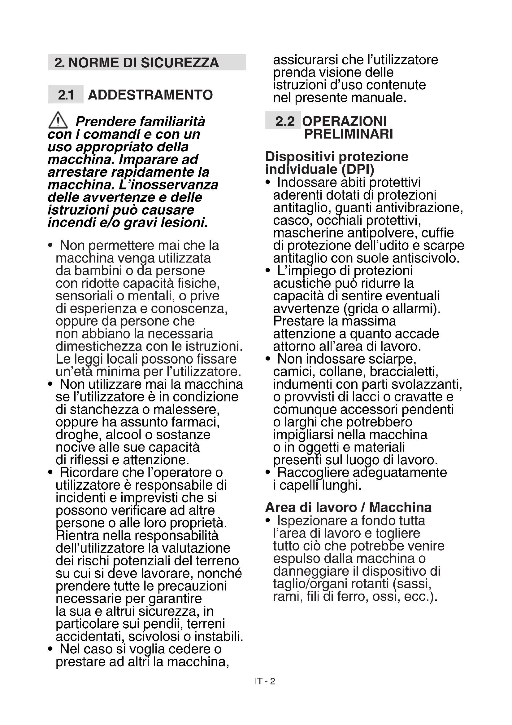 - Ispezionare a fondo tutta l’area di lavoro e togliere tutto ciò che potrebbe venire espulso dalla macchina o danneggiare il dispositivo di taglio/organi rotanti (sassi, rami, li di ferro, ossi, ecc.).IT - 3