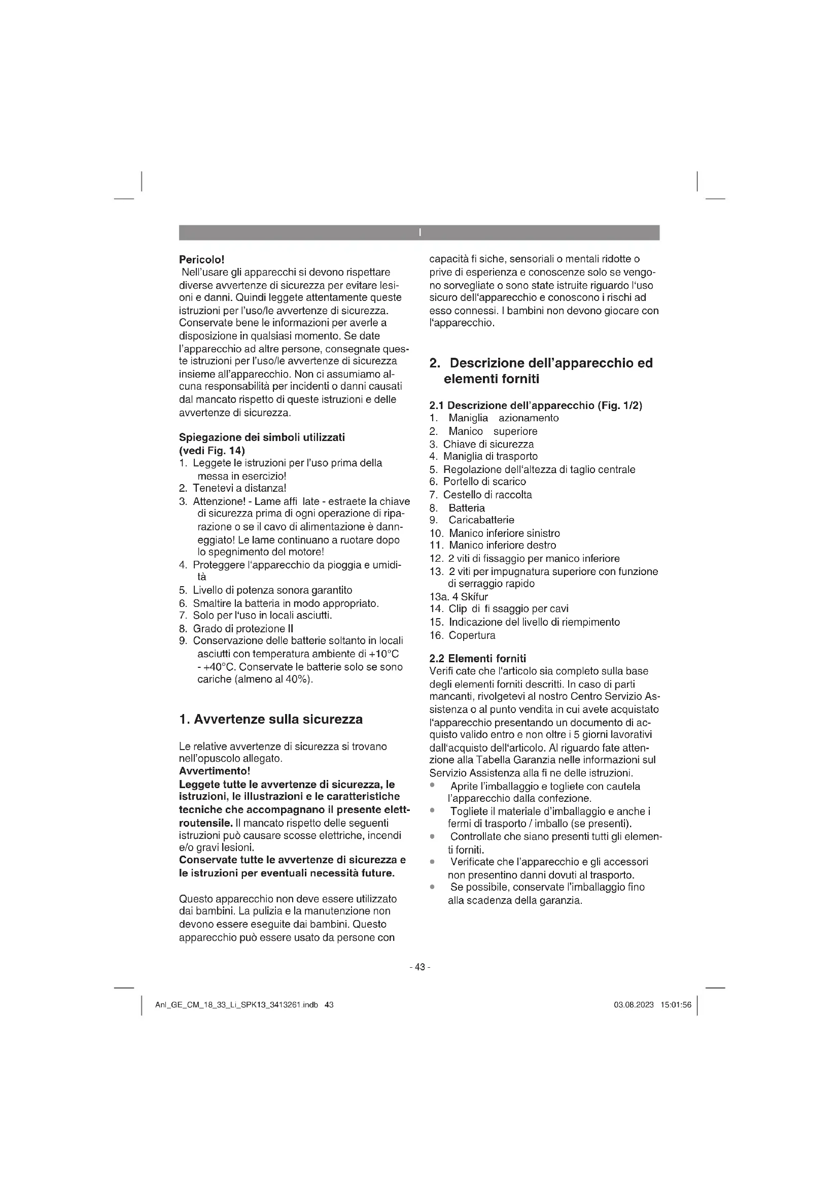 Attenzione! Il tosaerba è dotato di una chiave di sicurezza per evitare che venga utilizzato da persone non auto- rizzate. Inserite la chiave di sicurezza subito prima di mettere in esercizio il tosaerba (Fig. 12/Pos. 3). ed estraete nuovamente la chiave di sicurezza a ogni interruzione o conclusione del lavoro. Attenzione! Per evitare che venga inserito inavvertitamente, il tagliaerba è fornito di un blocco dell‘avviamento (Fig. 11/Pos. A) che deve venire premuto prima di poter attivare gli interruttori (Fig. 11/ Pos. 1). Se si mollano gli interruttori, il tagliaerba si spegne. Eseguite quest‘operazione più volte per assi- curarvi che l‘apparecchio funzioni correttamente. Prima di eseguire riparazioni o lavori di manuten- zione sull‘apparecchio dovete assicurarvi che la lama sia ferma e che sia stata tolta la chiave di sicurezza. Anl_GE_CM_18_33_Li_SPK13_3413261.indb 46Anl_GE_CM_18_33_Li_SPK13_3413261.indb 46 03.08.2023 15:01:5703.08.2023 15:01:57I
