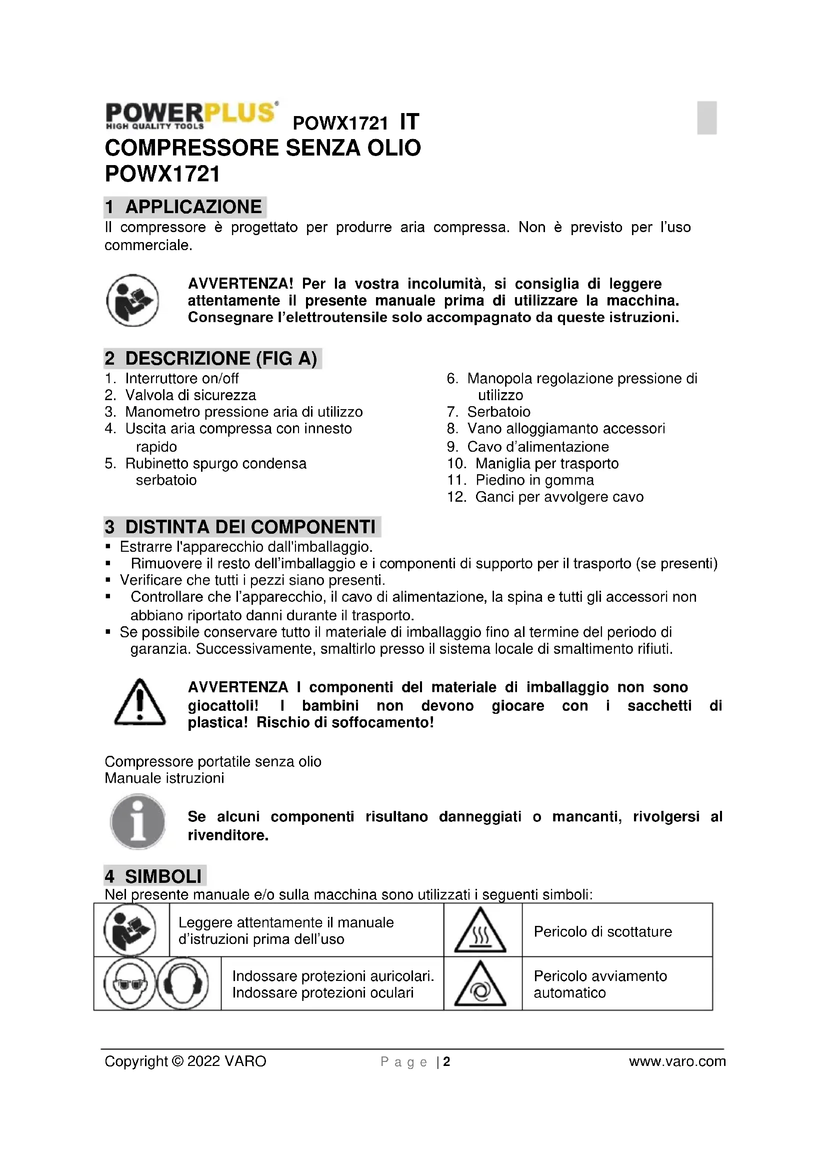 Questo simbolo indica le avvertenze da leggere attentamente prima di utilizzare il prodotto, in modo da prevenire possibili danni fisici all’utente. L’aria compressa è una forma di energia potenzialmente pericolosa, pertanto è necessario usare estrema cautela utilizzando il compressore e gli accessori. Attenzione: il compressore potrebbe ripartire in caso di black-out e successivo ripristino di tensione.POWX1721 IT Copyright © 2022 VARO P a g e | 5 www.varo.com Il valore di PRESSIONE ACUSTICA misurato 4 m. equivale al valore di POTENZA ACUSTICA dichiarato sull’etichetta gialla, posizionata sul compressore, meno 20 dB.