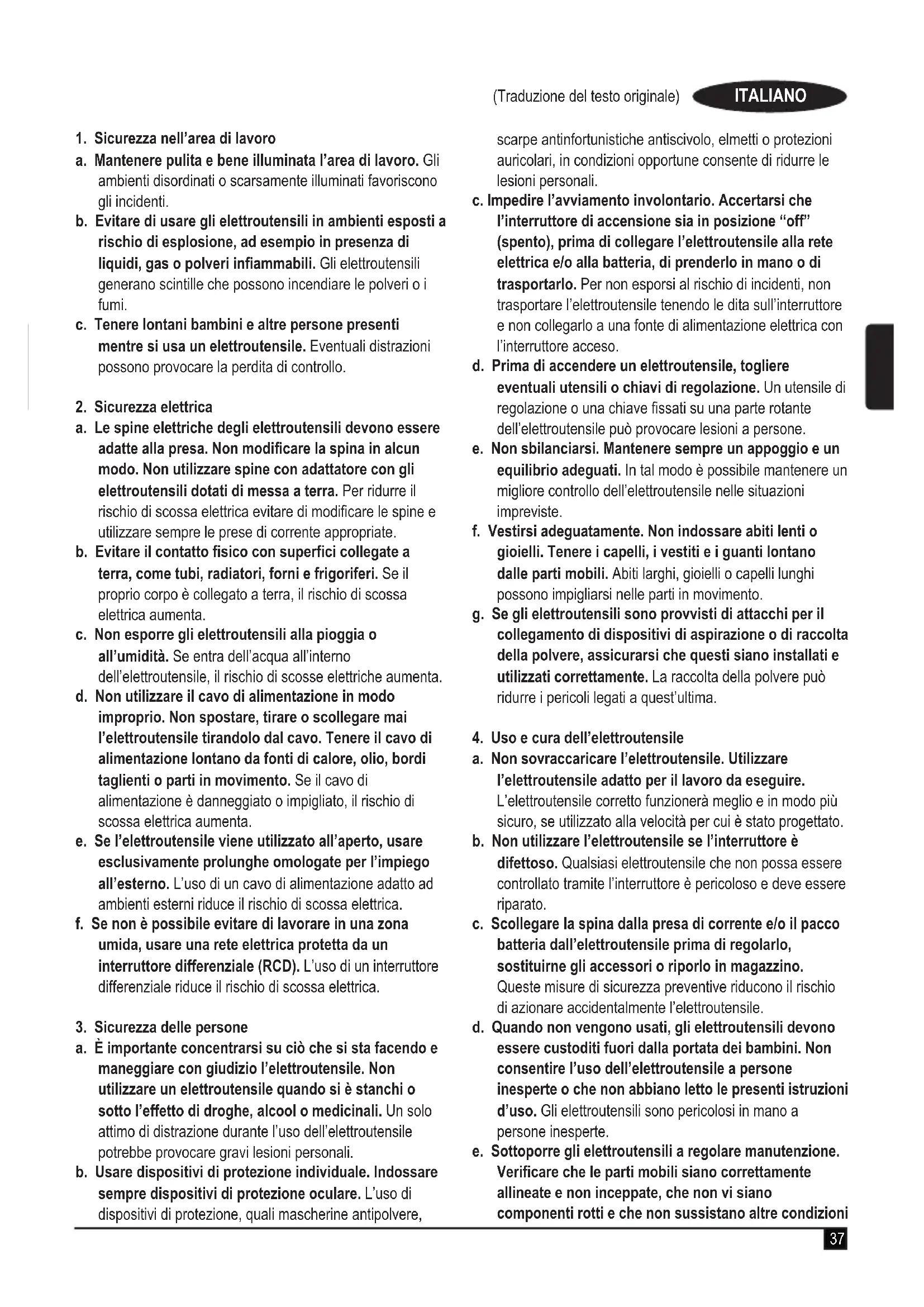 a. Non sovraccaricare l’elettroutensile. Utilizzare l’elettroutensile adatto per il lavoro da eseguire. L’elettroutensile corretto funzionerà meglio e in modo più sicuro, se utilizzato alla velocità per cui è stato progettato. b. Non utilizzare l’elettroutensile se l’interruttore è difettoso. Qualsiasi elettroutensile che non possa essere controllato tramite l’interruttore è pericoloso e deve essere riparato. c. Scollegare la spina dalla presa di corrente e/o il pacco batteria dall’elettroutensile prima di regolarlo, sostituirne gli accessori o riporlo in magazzino. Queste misure di sicurezza preventive riducono il rischio di azionare accidentalmente l’elettroutensile. d. Quando non vengono usati, gli elettroutensili devono essere custoditi fuori dalla portata dei bambini. Non consentire l’uso dell’elettroutensile a persone inesperte o che non abbiano letto le presenti istruzioni d’uso. Gli elettroutensili sono pericolosi in mano a persone inesperte. e. Sottoporre gli elettroutensili a regolare manutenzione. Vericare che le parti mobili siano correttamente allineate e non inceppate, che non vi siano componenti rotti e che non sussistano altre condizioni38 (Traduzione del testo originale) ITALIANO che possono compromettere il funzionamento dell’elettroutensile. Se danneggiato, far riparare l’elettroutensile prima dell’uso. Molti incidenti sono provocati da elettroutensili non sottoposti a corretta manutenzione. f. Mantenere aflati e puliti gli utensili da taglio. La manutenzione corretta degli utensili da taglio con bordi aflati riduce le probabilità di inceppamento e ne facilita il controllo. g. Utilizzare l’elettroutensile, gli accessori, le punte, ecc. in conformità alle presenti istruzioni, tenendo conto delle condizioni operative e del lavoro da eseguire. L’utilizzo dell’elettroutensile per impieghi diversi da quelli previsti può dare luogo a situazioni di pericolo.