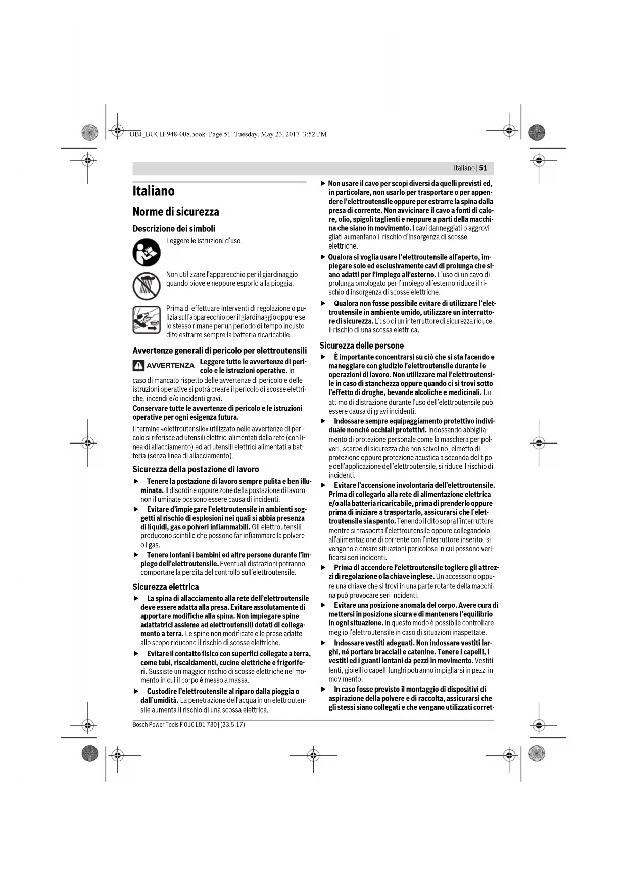 - in funzione della batteria ricaricabile utilizzata OBJ_BUCH-948-008.book Page 55 Tuesday, May 23, 2017 3:52 PM56 | Italiano F 016 L81 730 | (23.5.17) Bosch Power Tools Con questo elettroutensile non utilizzare la batteria ri- caricabile 4,0 Ah. Informazioni sulla rumorosità e sulla vibrazione Valori di emissione acustica rilevati conformemente a EN 60745-2-15. Il livello di rumore stimato A dell’apparecchio ammonta nor- malmente: Livello di pressione acustica 67 dB(A); livello di potenza sonora 87 dB(A). Incertezza della misura K =3 dB. Usare la protezione acustica! Valori complessivi di oscillazione a