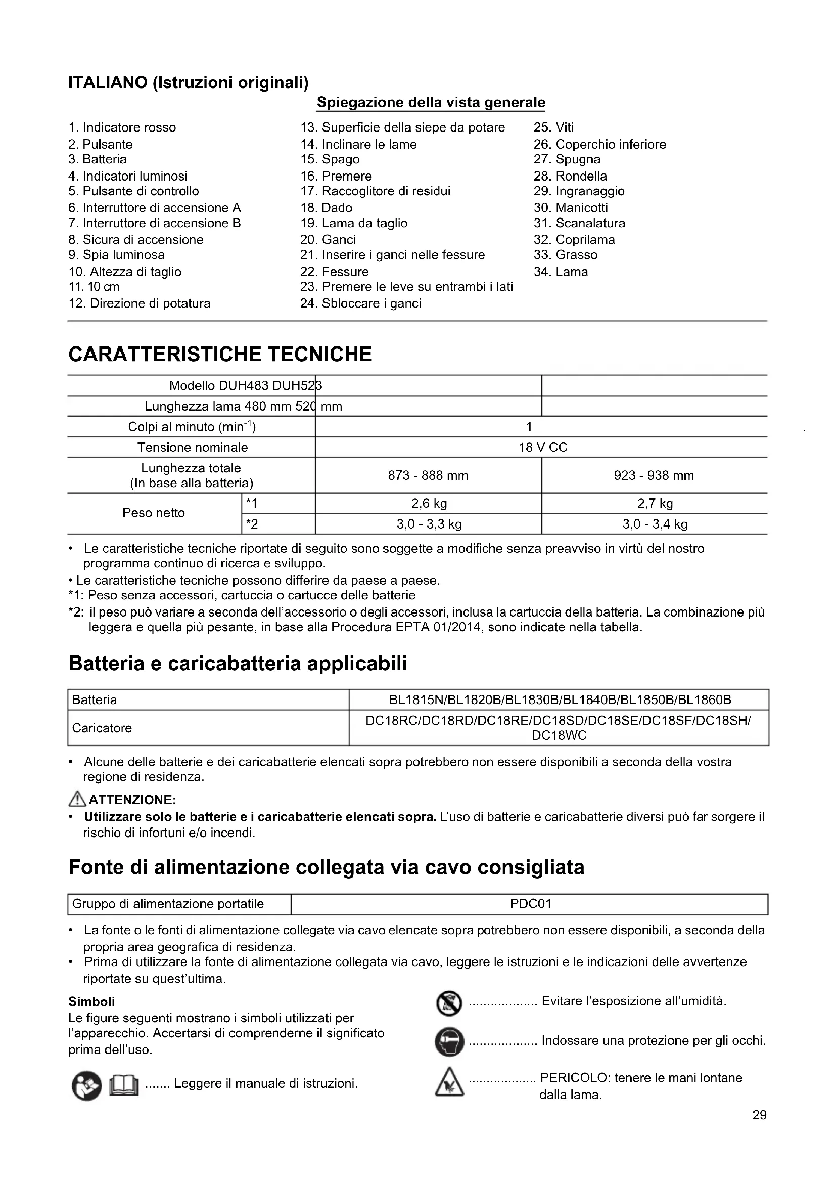 Peso netto *1 2,6 kg 2,7 kg *2 3,0 - 3,3 kg 3,0 - 3,4 kg Batteria BL1815N/BL1820B/BL1830B/BL1840B/BL1850B/BL1860B Caricatore DC18RC/DC18RD/DC18RE/DC18SD/DC18SE/DC18SF/DC18SH/ DC18WC Gruppo di alimentazione portatile PDC0130 ................... Indossare protezioni per gli occhi e le orecchie. ................... Non esporre alla pioggia. ............ Solo per le nazioni dell’EU A causa della presenza di componenti pericolosi nelle apparecchiature, i rifiuti di apparecchiature elettriche ed elettroniche, accumulatori e batterie potrebbero produrre un impatto negativo sull’ambiente e sulla salute umana. Non smaltire elettrodomestici elettrici ed elettronici o batterie insieme ai rifiuti domestici! In conformità alla direttiva europea sui rifiuti di apparecchiature elettriche ed elettroniche (RAEE), sugli accumulatori e le batterie, nonché sui rifiuti di accumulatori e batterie, e al suo adattamento alle normative nazionali, i rifiuti di apparecchiature elettriche ed elettroniche, batterie e accumulatori vanno conservati separatamente e conferiti a un punto di raccolta separato per i rifiuti comunali, operando in conformità alle normative per la protezione dell’ambiente. Tale requisito viene indicato mediante il simbolo del bidone della spazzatura con ruote barrato apposto sull’apparecchio. ................. Livello di potenza sonora garantita in base alla Direttiva rumore macchine all’aperto UE. ................. Livello di potenza sonora in base alla normativa sul controllo del rumore NSW australiana Uso previsto ENE014-1 L’utensile è progettato per la potatura delle siepi. Avvertenze generali relative alla sicurezza dell’utensile elettrico GEA010-2 AVVERTENZA: Leggere tutte le avvertenze di sicurezza, le istruzioni, le illustrazioni e i dati tecnici forniti con il presente utensile elettrico. La mancata osservanza di tutte le istruzioni elencate di seguito potrebbe risultare in scosse elettriche, incendi e/o gravi lesioni personali. Conservare tutte le avvertenze e le istruzioni come riferimento futuro. Il termine “utensile elettrico” nelle avvertenze si riferisce sia all’utensile elettrico (cablato) nel funzionamento alimentato da rete elettrica che all’utensile elettrico (a batteria) nel funzionamento alimentato a batteria. Avvertenze di sicurezza relative al tagliasiepi a batteria GEB278-1