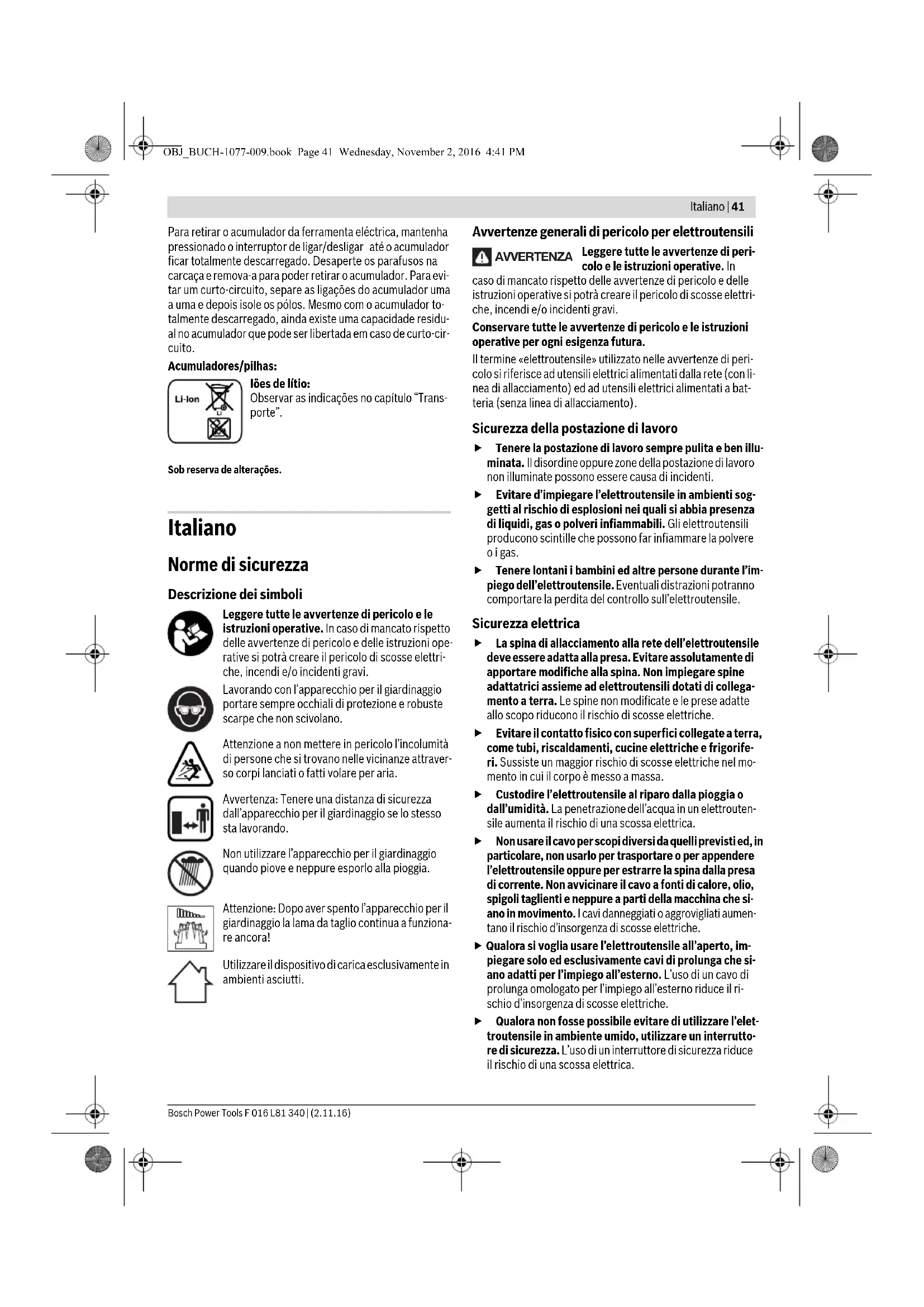 OBJ_BUCH-1077-009.book Page 39 Wednesday, November 2, 2016 4:41 PM40 | Português F 016 L81 340 | (2.11.16) Bosch Power Tools Com o interruptor de ligar-desligar semi-premido ou comple- tamente premido, a indicação do estado de carga do acumu- lador indica durante alguns segundos o estado de carga do acumulador. Busca de erros Manutenção e limpeza Atenção! Desligar o aparelho de jardim antes de traba- lhos de manutenção ou de limpeza. A lâmina ainda con- tinua a se movimentar durante alguns minutos após ter desligado o aparelho de jardim. Cuidado! Não toque na lâmina em movimento. Manter o aparelho de jardim sempre limpo, para traba- lhar bem e de forma segura. Sempre usar luvas de protecção para trabalhar com o aparelho de jardim ou para realizar trabalhos de manu- tenção ou de limpeza. Controlar regularmente o aparelho de jardim quanto a defei- tos evidentes, como por exemplo fixações soltas e compo- nentes gastos ou danificados. Serviço pós-venda e consultoria de aplicação www.bosch-garden.com Para todas as questões e encomendas de peças sobressalen- tas é imprescindível indicar o número de produto de 10 dígitos como consta na placa de características da ferra- menta eléctrica. Portugal Robert Bosch LDA Avenida Infante D. Henrique Lotes 2E – 3E 1800 Lisboa Para efectuar o seu pedido online de peças entre na página www.ferramentasbosch.com. Tel.: 21 8500000 Fax: 21 8511096 Brasil Robert Bosch Ltda. Caixa postal 1195 13065-900 Campinas Tel.: (0800) 7045446 www.bosch.com.br/contacto Transporte Os acumuladores de iões de lítio, contidos, estão sujeitos ao direito de materiais perigosos. Os acumuladores podem ser transportados na rua pelo utilizador, sem mais obrigações. Na expedição por terceiros (por ex.: transporte aéreo ou ex- pedição), devem ser observadas as especiais exigências quanto à embalagem e à designação. Neste caso é necessário consultar um especialista de materiais perigosos ao preparar a peça a ser trabalhada. Eliminação Os aparelhos de jardim, os acessórios e as embalagens de- vem ser dispostos para uma reciclagem ecológica de matérias primas. Não deitar os aparelhos de jardinagem, carregadores e acu- muladores/pilhas no lixo doméstico! Apenas países da União Europeia: Conforme as Directivas Europeias 2012/19/UE relativa aos resíduos apare- lhos eléctricos e eletrónicos velhos e con- forme a directiva europeia 2006/66/CE re- lativa a acumuladores/pilhas defeituosos ou gastos, estes devem ser recolhidos separadamente e con- duzidos a uma reciclagem ecológica. Acumuladores integrados só devem ser retirados para serem descartados. O aparelho de jardinagem pode ser danificado se a carcaça for aberta. LED Capacidade Luz verde permanente 35 –100% Luz intermitente verde 15 –35% Luz intermitente vermelha 5 – 15% Luz vermelha permanente 0 – 5% Sintomas Possível causa Solução A duração de corte por carga do acu- mulador é curta demais O acumulador está quase no fim da sua vida útil Dirija-se a uma oficina de servi- ço pós-venda A indicação de carga do acumulador está permanentemente ligada Nenhum processo de carga possível Acumulador com defeito Dirija-se a uma oficina de servi- ço pós-venda OBJ_BUCH-1077-009.book Page 40 Wednesday, November 2, 2016 4:41 PMItaliano | 41 Bosch Power Tools F 016 L81 340 | (2.11.16) Para retirar o acumulador da ferramenta eléctrica, mantenha pressionado o interruptor de ligar/desligar até o acumulador ficar totalmente descarregado. Desaperte os parafusos na carcaça e remova-a para poder retirar o acumulador. Para evi- tar um curto-circuito, separe as ligações do acumulador uma a uma e depois isole os pólos. Mesmo com o acumulador to- talmente descarregado, ainda existe uma capacidade residu- al no acumulador que pode ser libertada em caso de curto-cir- cuito. Acumuladores/pilhas: Iões de lítio: Observar as indicações no capítulo “Trans- porte”. Sob reserva de alterações. Italiano Norme di sicurezza Descrizione dei simboli Leggere tutte le avvertenze di pericolo e le istruzioni operative. In caso di mancato rispetto delle avvertenze di pericolo e delle istruzioni ope- rative si potrà creare il pericolo di scosse elettri- che, incendi e/o incidenti gravi. Lavorando con l’apparecchio per il giardinaggio portare sempre occhiali di protezione e robuste scarpe che non scivolano. Attenzione a non mettere in pericolo l’incolumità di persone che si trovano nelle vicinanze attraver- so corpi lanciati o fatti volare per aria. Avvertenza: Tenere una distanza di sicurezza dall’apparecchio per il giardinaggio se lo stesso sta lavorando. Non utilizzare l’apparecchio per il giardinaggio quando piove e neppure esporlo alla pioggia. Attenzione: Dopo aver spento l’apparecchio per il giardinaggio la lama da taglio continua a funziona- re ancora! Utilizzare il dispositivo di carica esclusivamente in ambienti asciutti. Avvertenze generali di pericolo per elettroutensili Leggere tutte le avvertenze di peri- colo e le istruzioni operative. In caso di mancato rispetto delle avvertenze di pericolo e delle istruzioni operative si potrà creare il pericolo di scosse elettri- che, incendi e/o incidenti gravi. Conservare tutte le avvertenze di pericolo e le istruzioni operative per ogni esigenza futura. Il termine «elettroutensile» utilizzato nelle avvertenze di peri- colo si riferisce ad utensili elettrici alimentati dalla rete (con li- nea di allacciamento) ed ad utensili elettrici alimentati a bat- teria (senza linea di allacciamento). Sicurezza della postazione di lavoro Tenere la postazione di lavoro sempre pulita e ben illu- minata. Il disordine oppure zone della postazione di lavoro non illuminate possono essere causa di incidenti. Evitare d’impiegare l’elettroutensile in ambienti sog- getti al rischio di esplosioni nei quali si abbia presenza di liquidi, gas o polveri infiammabili. Gli elettroutensili producono scintille che possono far infiammare l