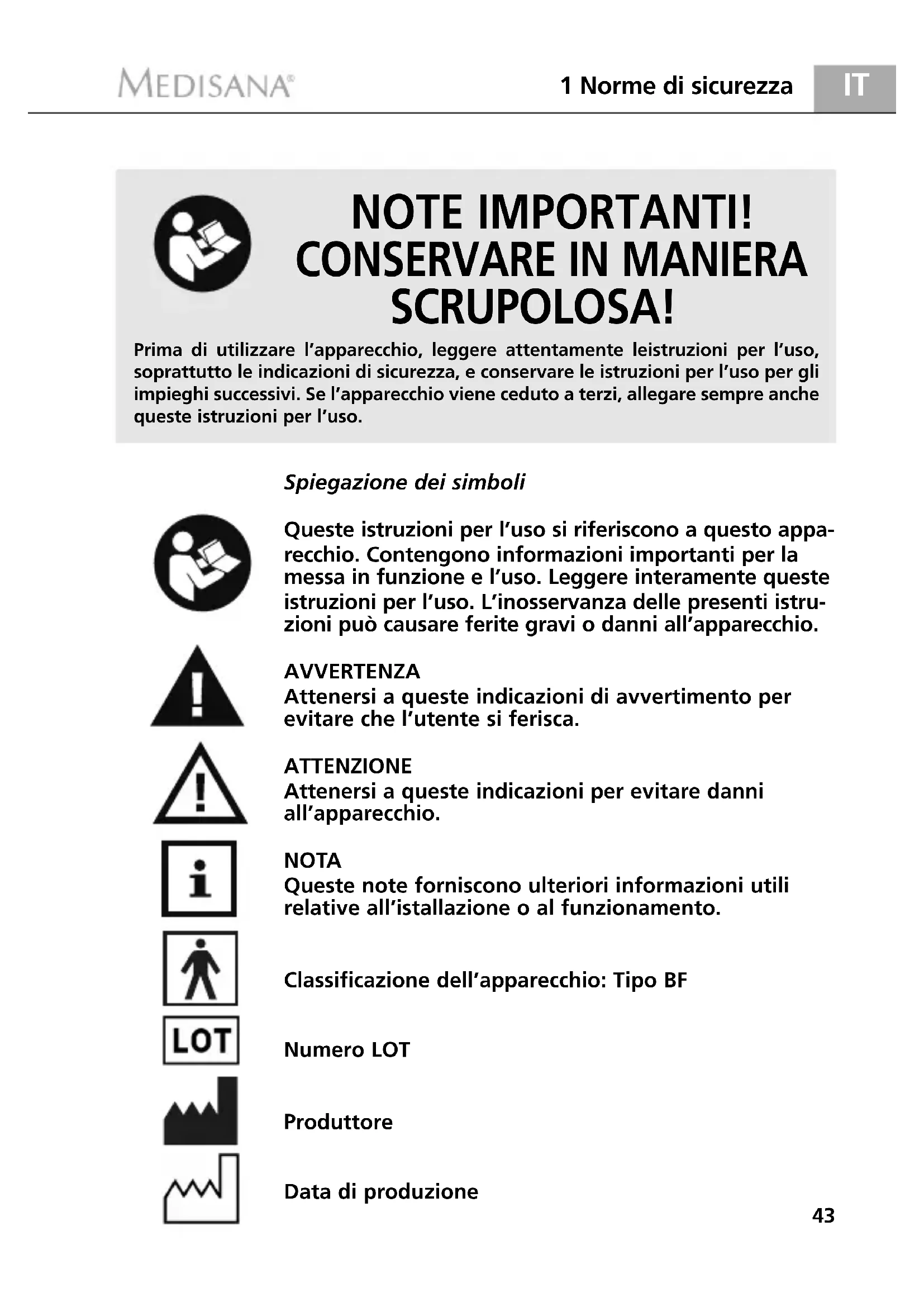 SCRUPOLOSA! Spiegazione dei simboli Queste istruzioni per l’uso si riferiscono a questo appa- recchio. Contengono informazioni importanti per la messa in funzione e l’uso. Leggere interamente queste istruzioni per l’uso. L’inosservanza delle presenti istru- zioni può causare ferite gravi o danni all’apparecchio. AVVERTENZA Attenersi a queste indicazioni di avvertimento per evitare che l’utente si ferisca. ATTENZIONE Attenersi a queste indicazioni per evitare danni all’apparecchio. NOTA Queste note forniscono ulteriori informazioni utili relative all’istallazione o al funzionamento. Classificazione dell’apparecchio: Tipo BF Numero LOT Produttore Data di produzione Prima di utilizzare l’apparecchio, leggere attentamente leistruzioni per l’uso,soprattutto le indicazioni di sicurezza, e conservare le istruzioni per l’uso per gliimpieghi successivi. Se l’apparecchio viene ceduto a terzi, allegare sempre anchequeste istruzioni per l’uso.MTP_Pro_51090_3MAM_West_21082017_Blutdruckmessgerät 21.08.17 07:36 Seite 431.2 Precauzioni di assoluta importanza