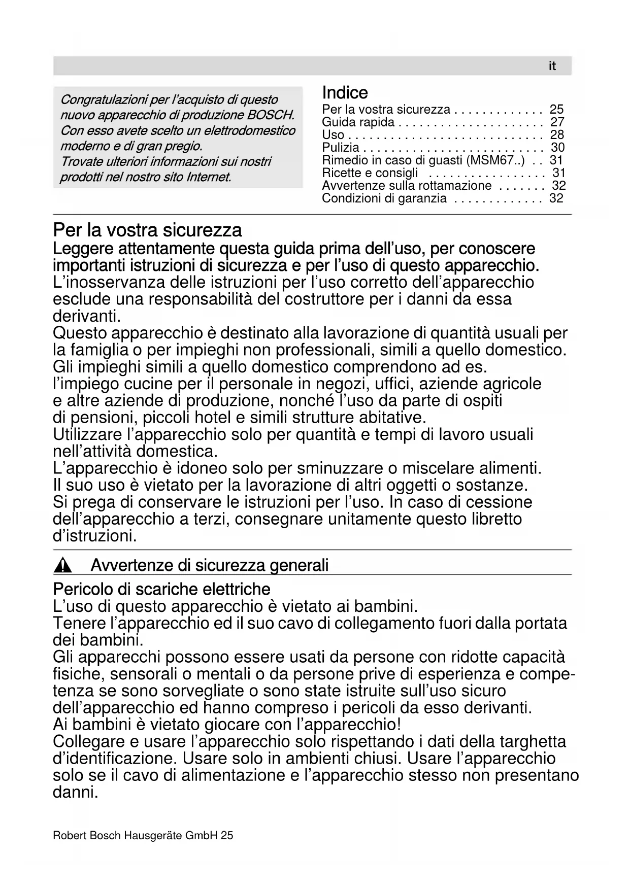 Congratulazioni per l’acquisto di questo nuovo apparecchio di produzione BOSCH. Con esso avete scelto un elettrodomestico moderno e di gran pregio. Trovate ulteriori informazioni sui nostri prodotti nel nostro sito Internet.26 Robert Bosch Hausgeräte GmbH Staccare sempre l’apparecchio dalla rete quando non è sorvegliato e prima del montaggio, dello smontaggio o della pulizia. Non tirare il cavo di alimentazione su spigoli vivi né metterlo a contatto con superfici calde. Al fine di evitare pericoli, se il cavo di alimentazione di questo apparecchio subisce danni, deve essere sostituito dal produttore, dal suo servizio assistenza clienti o da persona in possesso di simile qualificazione. Fare eseguire le riparazioni all’apparecchio solo dal nostro servizio assistenza clienti. , Avvertenze di sicurezza per questo apparecchio Pericolo ferite Pericolo di scariche elettriche Non usare il frullatore ad immersione con le mani umide, né farlo funzionare a vuoto. Non immergere l’apparecchio nel liquido lavorato oltre il punto di unione fra piede frullatore ed apparecchio base. Non immergere mai l’apparecchio base in liquidi né lavarlo nella lavastoviglie. Attenzione nella lavorazione di liquidi molto caldi. Durante la lavorazione i liquidi possono emettere spruzzi. Non deporre mai il piede frullatore su superfici molto calde, né utilizzarlo in alimenti da frullare bollenti. Prima di lavorare alimenti da frullare molto caldi con il frullatore, farli raffreddare ad almeno 80 °C! Se si usa il frullatore ad immersione in una pentola, togliere prima la pentola dal fuoco. Pericolo di ferite a causa di lame taglienti/ingranaggio in rotazione! Prima di sostituire accessori o pezzi di ricambio, che durante il funzionamento si muovono, l'apparecchio deve essere spento e staccato dalla rete. Non introdurre mai le dita nel piede frullatore. Non lavare mai le lame a mani nude. Usare una spazzola. Non introdurre mai le dita fra i taglienti della lama universale. Afferrare la lama universale solo sul bordo di presa in plastica. Prestare molta attenzione nel manipolare gli inserti! Nell’inserimento nel disco portante prestare attenzione alla forma ed alla posizione dell’inserto. Afferrare il disco portante solo sulle previste cavità di presa. Non introdurre le mani nell’apertura di aggiunta ingredienti. Per spingere usare solo il pestello. Nei lavori con l’accessorio multifunzione accendere l’apparecchio base solo con coperchio applicato e ben stretto. Non maneggiare la lame a mani nude. Per la pulizia usare una spazzola. áíRobert Bosch Hausgeräte GmbH 27 Importante! Usare il frullatore solo con gli accessori originali. Applicare e rimuovere gli accessori solo ad apparecchio base fermo. Non inserire mai nell’apparecchio base la frusta per montare priva dell’adattatore ingranaggio. Non immergere mai l’adattatore ingra- naggio in liquidi e non lavarlo sotto acqua corrente o nella lavasto- viglie. Non lavorare mai con il frullatore ad immersione/piede frullatore nel contenitore dell’accessorio multifunzione. Il bicchiere frullatore non è idoneo per l’uso nel forno a microonde. Il contenitore dell’accessorio multifunzione non sono adatti per forno a microonde. Non immergere mai il coperchio dell’accessorio multifunzione in liquidi né lavarlo nella lavastoviglie. Si consiglia di non lasciare mai l’apparecchio acceso più a lungo di quanto è necessario per la lavorazione del frullato. , Spiegazione dei simboli sull’apparecchio o sugli accessori Attenzione: Utensili rotanti. Non introdurre le mani nell’apertura di aggiunta ingredienti. Guida rapida Aprire le pagine con le figure. Figura 1 Apparecchio base 2 Cavo d’alimentazione 3 Regolazione del numero di giri Velocità di lavoro a regolazione continua fra minimo () e massimo (12) (solo nell’uso con il pulsante 4a). 4 Pulsante di accensione a Velocità regolabile (con velocità di regolazione della rotazione 3) b Velocità turbo Il frullatore ad immersione è acceso finché si tiene premuto un pulsante di accensione (a oppure b). La velocità turbo si utilizza per il mini tritatutto (se compreso nella fornitura). 5 Pulsanti di sblocco Per rimuovere il piede frullatore premere contemporaneamente i due pulsanti di sblocco. 6 Piede frullatore Applicare ed arrestare il piede frullatore. 7 Lama del piede frullatore 8 Bicchiere frullatore Impedisce gli spruzzi durante il lavoro nel bicchiere frullatore. 9 Coperchio Applicare sul bicchiere frullatore il coperchio per conservare alimenti lavorati. Frusta per montare: 10 Frusta per montare 11 Adattatore ingranaggio Accessorio multifunzione: 12 Ciotola 13 Lama universale 14 Disco portante per inserti del disco 15 Dischi a inserto a) Inserto per affettare – grosso b) Inserto per affettare – fine c) Inserto grattugia – media d) Disco grattugia a inserto – grosso 16 Coperchio con ingranaggio 17 Pestello áí28 Robert Bosch Hausgeräte GmbH Uso Attenzione! Il fondo del contenitore usato non deve presentare sporgenze o gradini. Al primo uso pulire tutte le parti. Piede frullatore Il piede del frullatore è idoneo per frullare maionese, salse, cocktail, alimenti per neonati, frutta cotta e verdura.Per frullare a puré le minestre.Per la lavorazione si consiglia l’uso del bicchiere frullatore fornito a corredo. Ma possono essere usati anche altri idonei contenitori.Figura Svolgere completamente il cavo di alimentazione. Inserire il piede del frullatore nel blocco motore ed arrestarlo. Inserire la spina. Versare l’alimento nel bicchiere frullatore o in un altro contenitore alto. Il frullatore ad immersione funziona meglio se fra gli alimenti da lavorare vi è un liquido. Regolare la velocità desiderata con il regolatore del numero di giri (cáÖìê~ -5). Per liquidi, frullati molto caldi e per incorporare (ad es. müsli in yogurt) si consiglia, di utilizzare una velocità inferiore. Le velocità elevate sono consigliabili per lavorare alimenti più solidi. Mantenere 