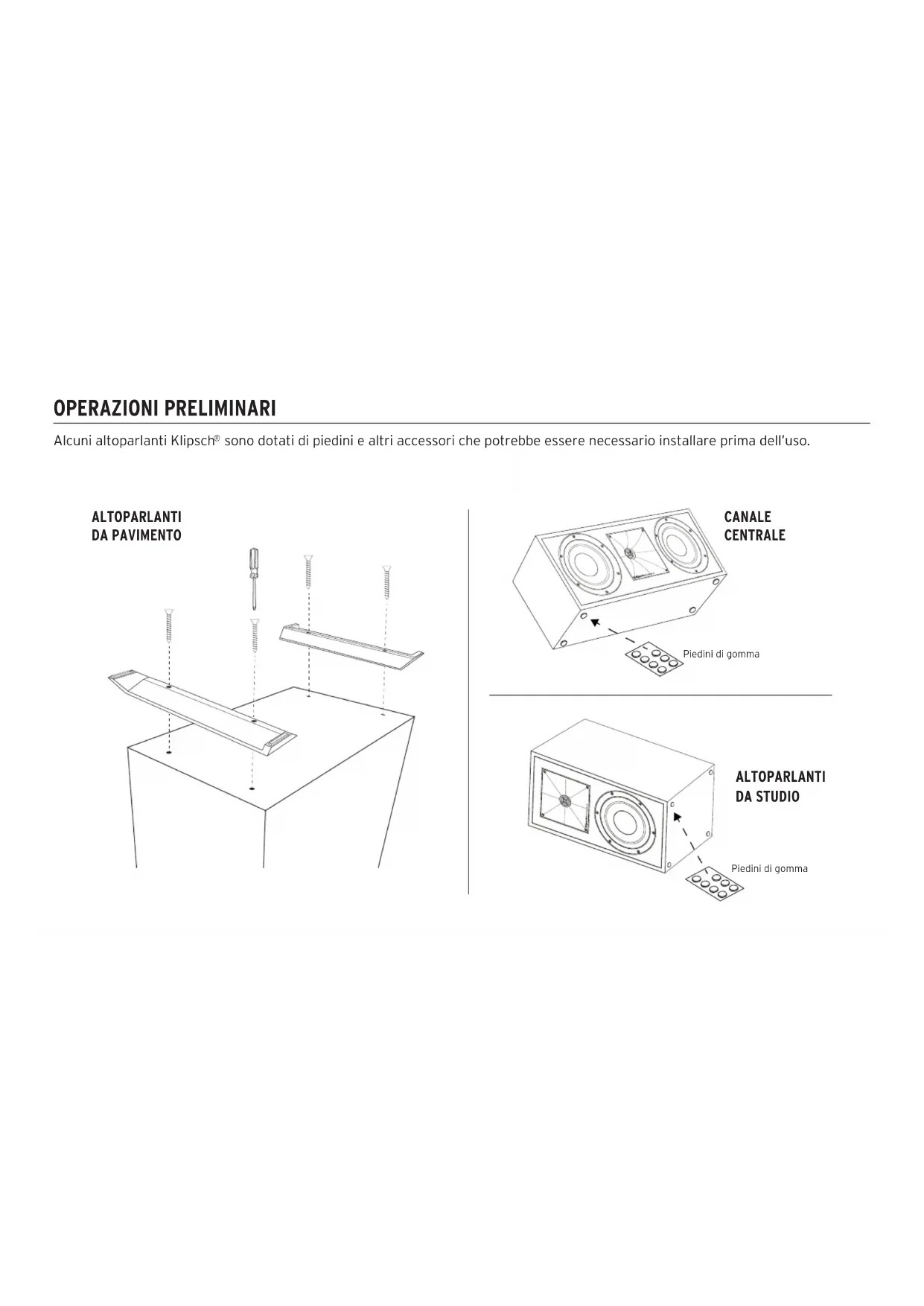 sono dotati di piedini e altri accessori che potrebbe essere necessario installare prima dell’uso. Piedini di gomma Piedini di gomma CANALE CENTRALE ALTOPARLANTI DA PAVIMENTO ALTOPARLANTI