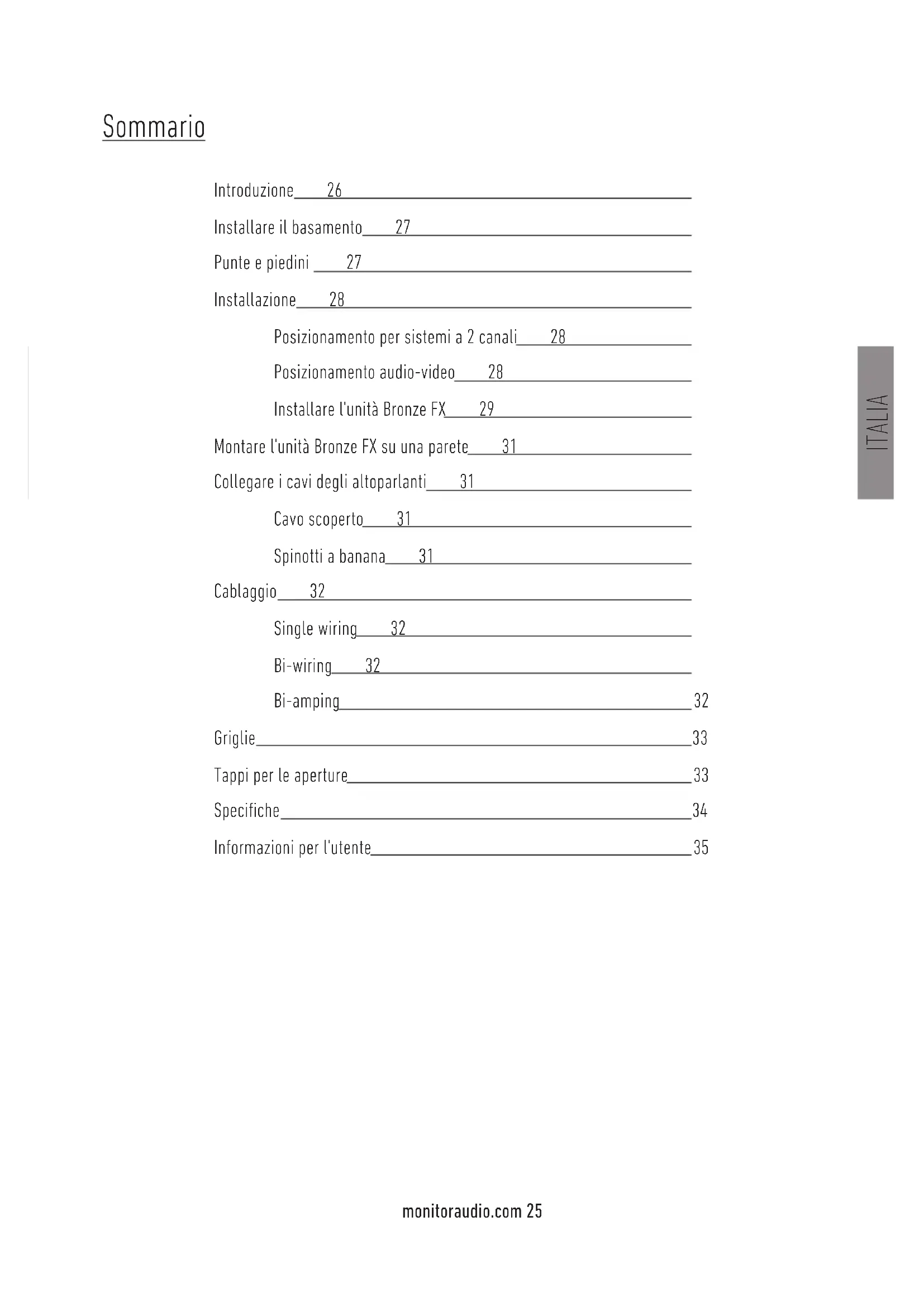 11/16 x 9 1/4 x 13 3/4 pouces N/D N/D Poids (par haut-parleur) 3,5kg (7lb 12oz) 5,3kg (11lb 10oz) 11kg (24lb 6oz) 16,6kg (36lb 8oz) 5,6kg (12lb 6oz) 3,2kg (7lb) Finitions Chêne noir, frêne blanc, noyer, rosemahFRANCAIS monitoraudio.com 23 Informations utilisateur Détails du produit Modèle Numéro de série du produit Date d'achat Informations du revendeur Nom du revendeur Adresse Adresse e-mail Numéro de téléphone Monitor Audio se réserve le droit de modier les spécications sans notication préalable. Pour bénécier de la garantie fabricant de 5ans veuillez remplir le formulaire en ligne à l'adresse suivante: www.monitoraudio.com Monitor Audio Ltd. 24 Brook Road Rayleigh, Essex SS6 7XJ Angleterre Tél : +44 (0)1268 740580 Fax : +44 (0)1268 740589 E-mail: info@monitoraudio.co.uk Site web: www.monitoraudio.com Conçu et élaboré au Royaume-Uni Fabriqué en ChineBronze Series24 manuale utente BRONZE SERIES BRONZE 1 BRONZE 2 BRONZE 5 BRONZE 6 BRONZE CENTRE BRONZE FX BRONZE W10 BRONZE SERIES BRONZE 1 BRONZE 2 BRONZE 5 BRONZE 6 BRONZE CENTRE BRONZE FX BRONZE W10ItALIA monitoraudio.com 25 Sommario Introduzione 26 Installare il basamento 27 Punte e piedini 27 Installazione 28 Posizionamento per sistemi a 2 canali 28 Posizionamento audio-video 28 Installare l'unità Bronze FX 29 Montare l'unità Bronze FX su una parete 31 Collegare i cavi degli altoparlanti 31 Cavo scoperto 31 Spinotti a banana 31 Cablaggio 32 Single wiring 32 Bi-wiring 32 Bi-amping 32 Griglie 33 Tappi per le aperture 33 Speciche 34 Informazioni per l'utente 35Bronze Series26 Introduzione Questa è la serie Bronze, il sistema di altoparlanti più conveniente di Monitor Audio, che unisce il meglio dei suoi premiati predecessori alle avanzate tecnologie della nostra esclusiva serie Silver e del nostro ore all'occhiello, la serie Platinum. La serie Bronze supera di gran lunga gli standard di prestazioni e qualità che vi aspettereste normalmente da una gamma di prodotti di "livello base". Utilizzando simulazioni al computer sempre più accurate e introducendo materiali e strutture ancora più ranate, abbiamo migliorato la nostra acclamata serie Bronze BX no a raggiungere nuovi standard di qualità. Lo sviluppo del suo suono preciso e naturalmente dinamico pone il suo successore, la serie Bronze, su un modo livello ben superiore a quello di molti altri marchi più costosi. Nella serie Bronze i frutti della nostre incessanti ricerche per la purezza del suono sono dedicati al godimento della musica e dell'audio dei lm. Le unità Bronze sono state progettate anche per eccellere nell'estetica. Ottenendo maggiore precisione ed ecienza grazie ai risultati di test e misurazioni, i nostri team sono riusciti a unire splendidamente fedeltà impareggiabile e design elegante che rappresenta il vero spirito di Monitor Audio. Paradossalmente, per essere una serie di livello base, la serie Bronze fa classe a parte. Grazie alle splendide niture di vinile in frassino bianco, rovere moro, rosemah o noce e alla precisione che rappresenta il marchio Monitor Audio in tutto il mondo, i sette eleganti modelli della serie Bronze avranno un look magnico in tutte le stanze. La loro sobria eleganza nasconde un design ergonomico sosticato, che include strutture casse multicamera per ottimizzare le prestazioni dei driver, connessioni ad alta qualità per facilitare l'utilizzo e trasferimento del segnale impeccabile e appoggi invisibili e precisi per una stabilità eccellente.ItALIA monitoraudio.com 27 Installare il basamento (solo Bronze 5 e 6) Le unità Bronze 5 e 6 sono fornite di basamenti che migliorano la stabilità e la risposta acustica. I basamenti si ssano sulle unità con i bulloni in dotazione. Prima di montare il basamento, assicurarsi che sul pavimento non ci siano oggetti duri o taglienti. Ribaltare la cassa in modo che la parte inferiore sia rivolta verso l'alto. Posizionare il basamento sulla cassa e allineare i fori per i bulloni con gli inserti sulla cassa. Utilizzare i bulloni per ssare il basamento sulla cassa. Stringerli poco per volta e vericare che il basamento sia ssato saldamente. Prima di ribaltare nuovamente la cassa, installare i piedini/le punte sul basamento. Punte e piedini Gli altoparlanti da pavimento della serie Bronze hanno in dotazione piedini a punta e in gomma a parte. I piedini a punta devono essere usati sui pavimenti con moquette, mentre quelli in gomma sui pavimenti duri e non adatti alle punte. I piedini a punta devono essere avvitati negli inserti lettati presenti sul fondo del basamento. Se non si desidera usare il basamento, è possibile montare le punte direttamente nella parte inferiore della cassa. Assicurarsi che nel luogo in cui vengono posizionati gli altoparlanti non ci siano cavi pendenti. NOTA BENE: se si decide di non usare il basamento, la stabilità della cassa sarà minore. Se la cassa viene posizionata su un pavimento duro, è suciente inserire i piedini di gomma negli inserti altrimenti occupati dalle punte.Bronze Series28 Installazione Posizionamento per sistemi a 2 canali Per l'utilizzo in un sistema a 2 canali, la posizione d'ascolto e gli altoparlanti dovrebbero formare un triangolo equilatero. Le casse andrebbero posizionate a una distanza di circa 1,8 m - 3 m l'una dall'altra. Idealmente dovrebbero trovarsi a 20 cm - 45 cm dalla parete posteriore e a circa 1 m dalle pareti laterali. È vivamente consigliato provare varie soluzioni quando si installano gli altoparlanti per la prima volta, così da poter fare la scelta migliore in base all'ambiente e alle preferenze personali. Se ad esempio i bassi sono insucienti, provare ad avvicinare gli altoparlanti a una parete. Se invece i bassi sono eccessivi, provare ad allontanarli. Leggere anche le informazioni sui tappi per le aperture a pagina 33. Se la resa stereo si è deteriorata, provare a ruotare leggermente gli altoparlanti verso il punto d'ascolto. Il suono dovrebbe sembrare provenire dal punto centrale fra gli altoparlanti, non dalle