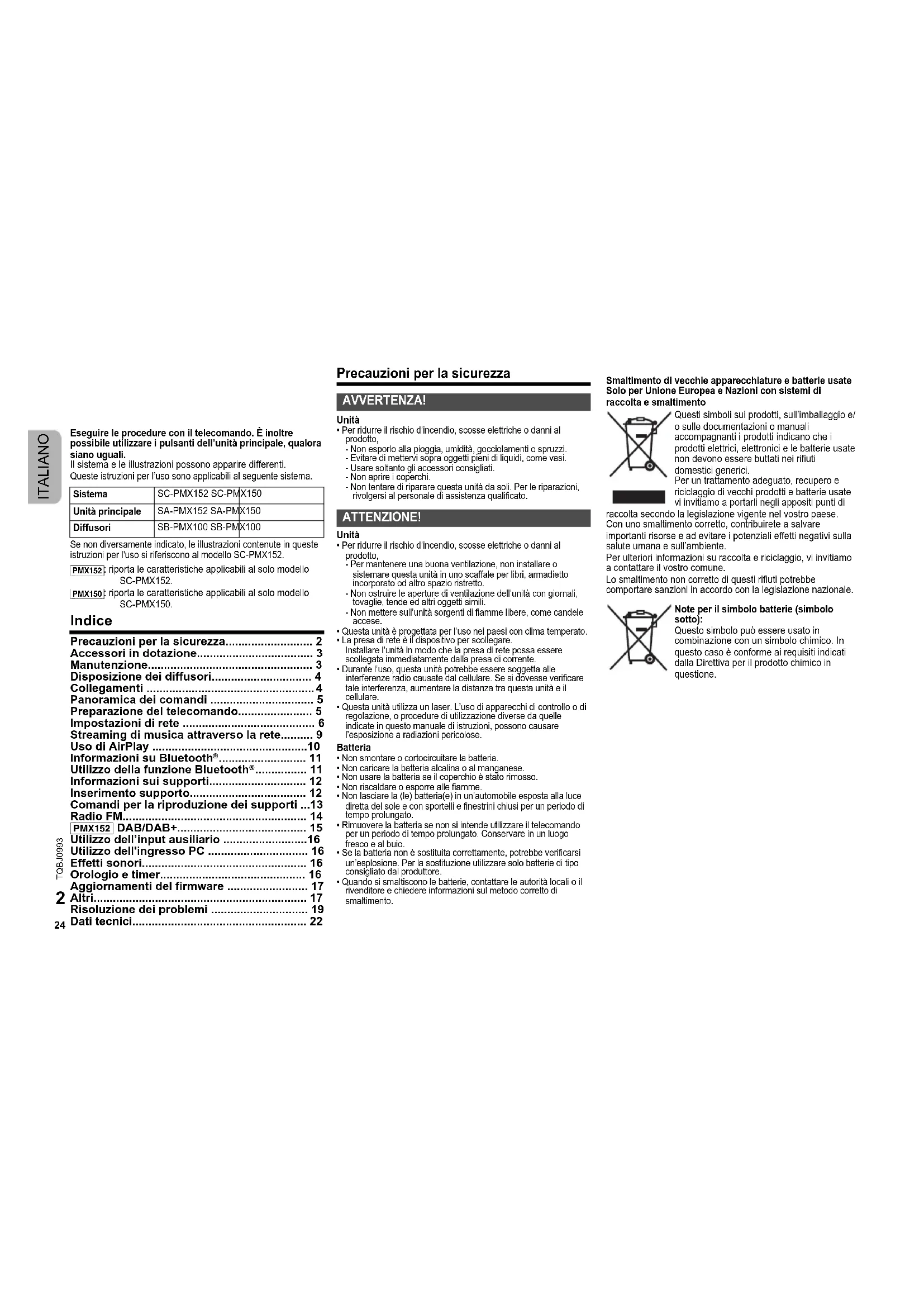 - Non smontare o cortocircuitare la batteria.• Non caricare la batteria alcalina o al manganese.• Non usare la batteria se il coperchio è stato rimosso.• Non riscaldare o esporre alle fiamme.• Non lasciare la (le) batteria(e) in un’automobile esposta alla luce diretta del sole e con sportelli e finestrini chiusi per un periodo di tempo prolungato.• Rimuovere la batteria se non si intende utilizzare il telecomando per un periodo di tempo prolungato. Conservare in un luogo fresco e al buio.• Se la batteria non è sostituita correttamente, potrebbe verificarsi un’esplosione. Per la sostituzione utilizzare solo batterie di tipo consigliato dal produttore.• Quando si smaltiscono le batterie, contattare le autorità locali o il rivenditore e chiedere informazioni sul metodo corretto di smaltimento. Sistema SC-PMX152 SC-PMX150 Unità principale SA-PMX152 SA-PMX150 Diffusori SB-PMX100 SB-PMX100 [PMX152] : riporta le caratteristiche applicabili al solo modello SC-PMX152. [PMX150] : riporta le caratteristiche applicabili al solo modello SC-PMX150. AVVERTENZA! ATTENZIONE! Smaltimento di vecchie apparecchiature e batterie usate Solo per Unione Europea e Nazioni con sistemi di raccolta e smaltimento Questi simboli sui prodotti, sull’imballaggio e/ o sulle documentazioni o manuali accompagnanti i prodotti indicano che i prodotti elettrici, elettronici e le batterie usate non devono essere buttati nei rifiuti domestici generici. Per un trattamento adeguato, recupero e riciclaggio di vecchi prodotti e batterie usate vi invitiamo a portarli negli appositi punti di raccolta secondo la legislazione vigente nel vostro paese. Con uno smaltimento corretto, contribuirete a salvare importanti risorse e ad evitare i potenziali effetti negativi sulla salute umana e sull’ambiente. Per ulteriori informazioni su raccolta e riciclaggio, vi invitiamo a contattare il vostro comune. Lo smaltimento non corretto di questi rifiuti potrebbe comportare sanzioni in accordo con la legislazione nazionale. Note per il simbolo batterie (simbolo sotto): Questo simbolo può essere usato in combinazione con un simbolo chimico. In questo caso è conforme ai requisiti indicati dalla Direttiva per il prodotto chimico in questione.