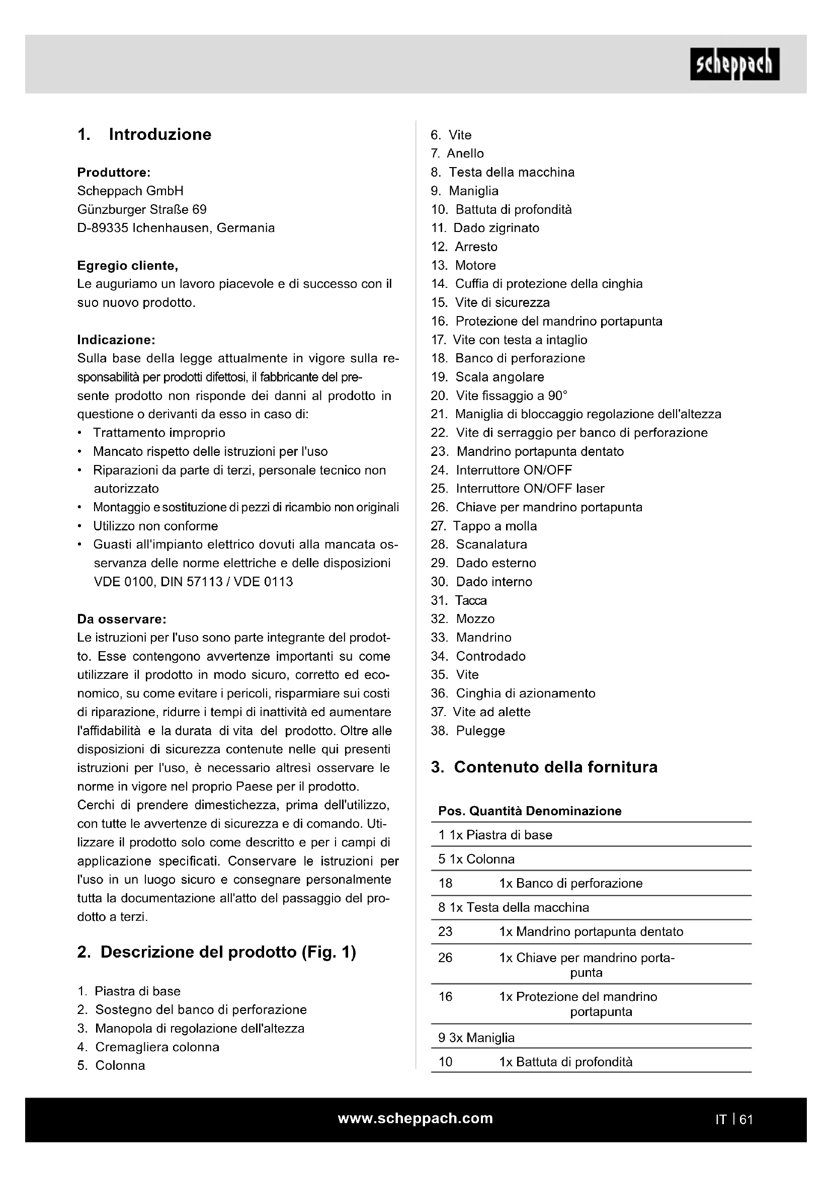 ne d'uso La trapanatrice da banco è destinato alla foratura di metallo, plastica, legno e materiali simili e può essere utilizzato solo in ambito domestico. Non è consentito lavorare con la macchina alimenti e materiali pericolosi per la salute. Il mandrino portapunta è adatto solo per l'utilizzo con punte da trapano e attrezzi con un diametro del gambo di 1,5 - 13 mm e gambo dell'attrezzo cilindrico. Inoltre, è possibile utilizzare anche attrezzi con gambo conico. Il prodotto è destinato all'uso da parte di adulti. Il pro- dotto non è destinato all'uso da parte di persone di età inferiore ai 16 anni. I minori di 16 anni possono utilizza- re il prodotto solo sotto supervisione. È consentito impiegare il prodotto solo conformemente alla sua destinazione d'uso. Un uso diverso o che oltre- passi quello previsto è da considerarsi non conforme. L'utente/l'operatore, e non il produttore, è unico respon- sabile dei danni o di qualsiasi tipo di lesione derivante. L'osservanza delle indicazioni di sicurezza, nonché il rispetto delle istruzioni di montaggio e delle indicazioni operative contenute nelle istruzioni per l'uso sono fon- damentali al ne di un utilizzo del dispositivo conforme alla destinazione d'uso. Le persone che utilizzano il prodotto e ne eseguono la ma- nutenzione devono possedere una certa dimestichezza con lo stesso ed essere al corrente dei possibili pericoli. Modiche al prodotto escludono completamente la re- sponsabilità del produttore per i danni che ne derivano. Il prodotto può essere utilizzato soltanto con compo- nenti e accessori originali del produttore. Le disposizioni relative alla sicurezza, al lavoro e alla manutenzione del produttore e le misure indicate nei Dati tecnici devono essere rispettate. Si prega di osservare che i nostri prodotti non sono de- stinati a un uso commerciale, artigianale o industriale. Si declina ogni responsabilità qualora il prodotto venga impiegato nel quadro di un'attività commerciale, arti- gianale, industriale o simili. Il fabbricante non si assume alcuna responsabilità per danni causati da un impiego non conforme alla destina- zione d'uso o da un utilizzo improprio.www.scheppach.com