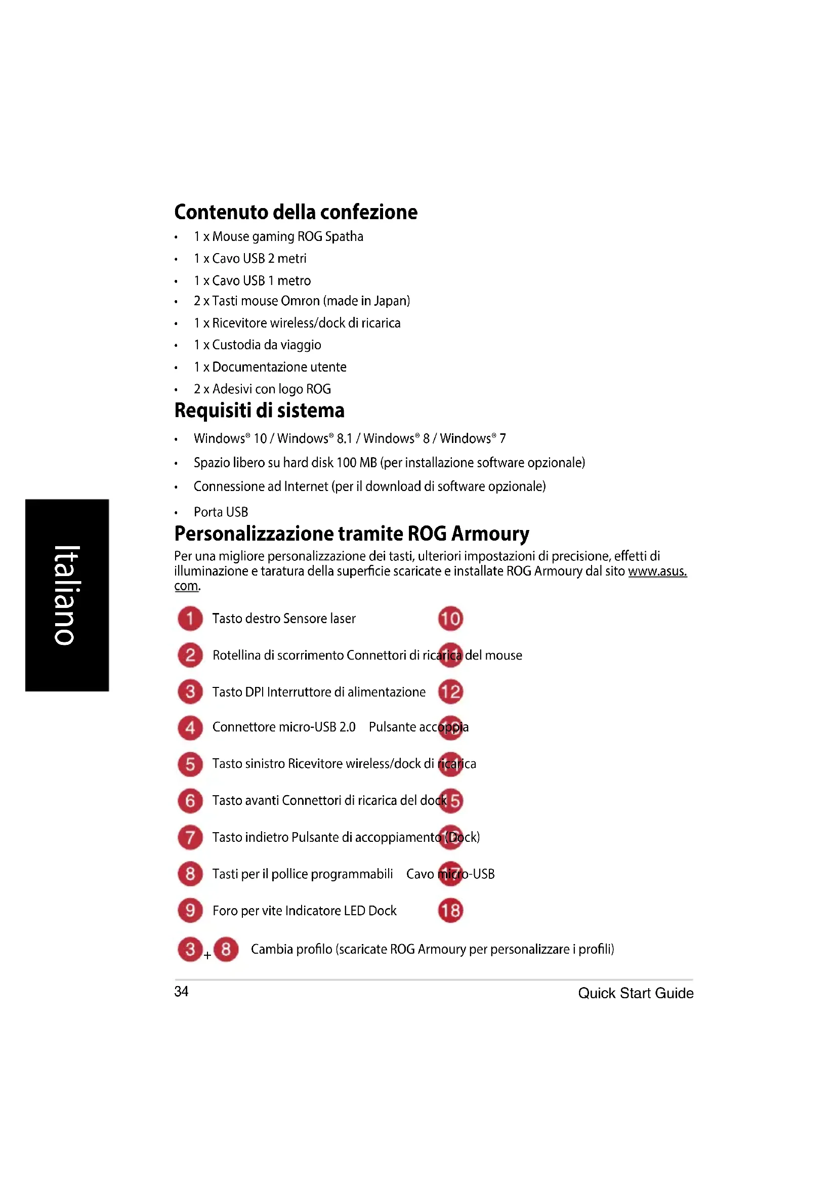Cambiaprolo(scaricateROGArmouryperpersonalizzareiproli)35 Mouse gaming ROG Spatha Italiano Per iniziare Per impostare il vostro mouse gaming ROG Spatha come mouse cablato: