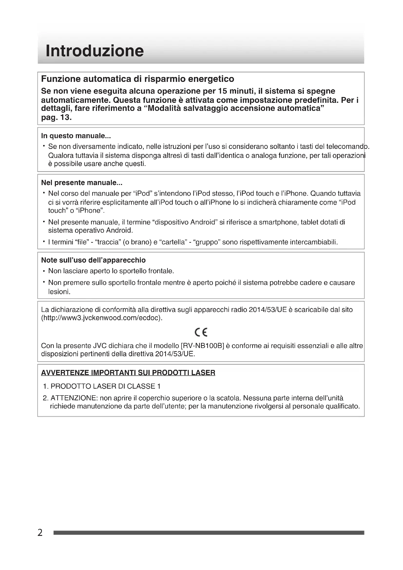 Non premere sullo sportello frontale mentre è aperto poiché il sistema potrebbe cadere e causare lesioni. La dichiarazione di conformità alla direttiva sugli apparecchi radio 2014/53/UE è scaricabile dal sito (http://www3.jvckenwood.com/ecdoc). Con la presente JVC dichiara che il modello [RV-NB100B] è conforme ai requisiti essenziali e alle altre disposizioni pertinenti della direttiva 2014/53/UE.