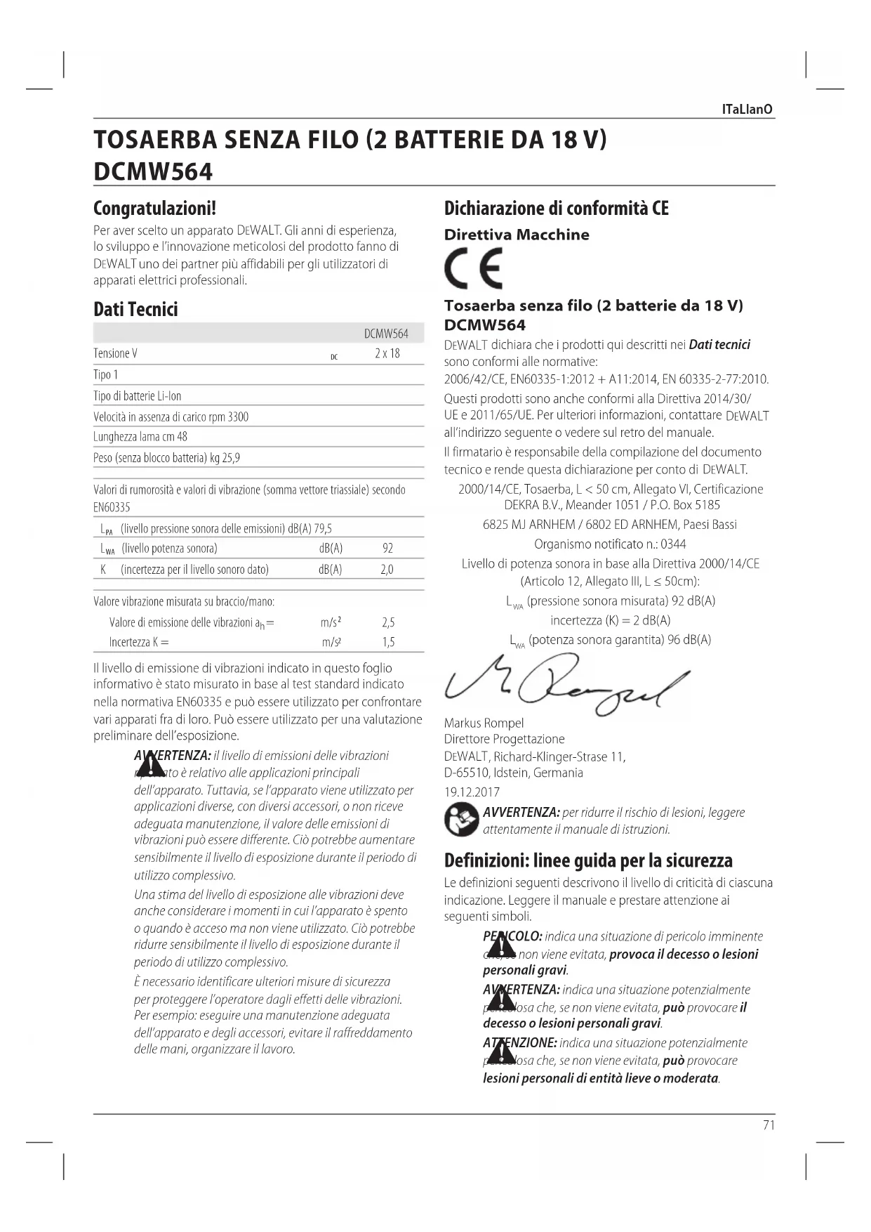 Il firmatario è responsabile della compilazione del documento tecnico e rende questa dichiarazione per conto di DEWALT.