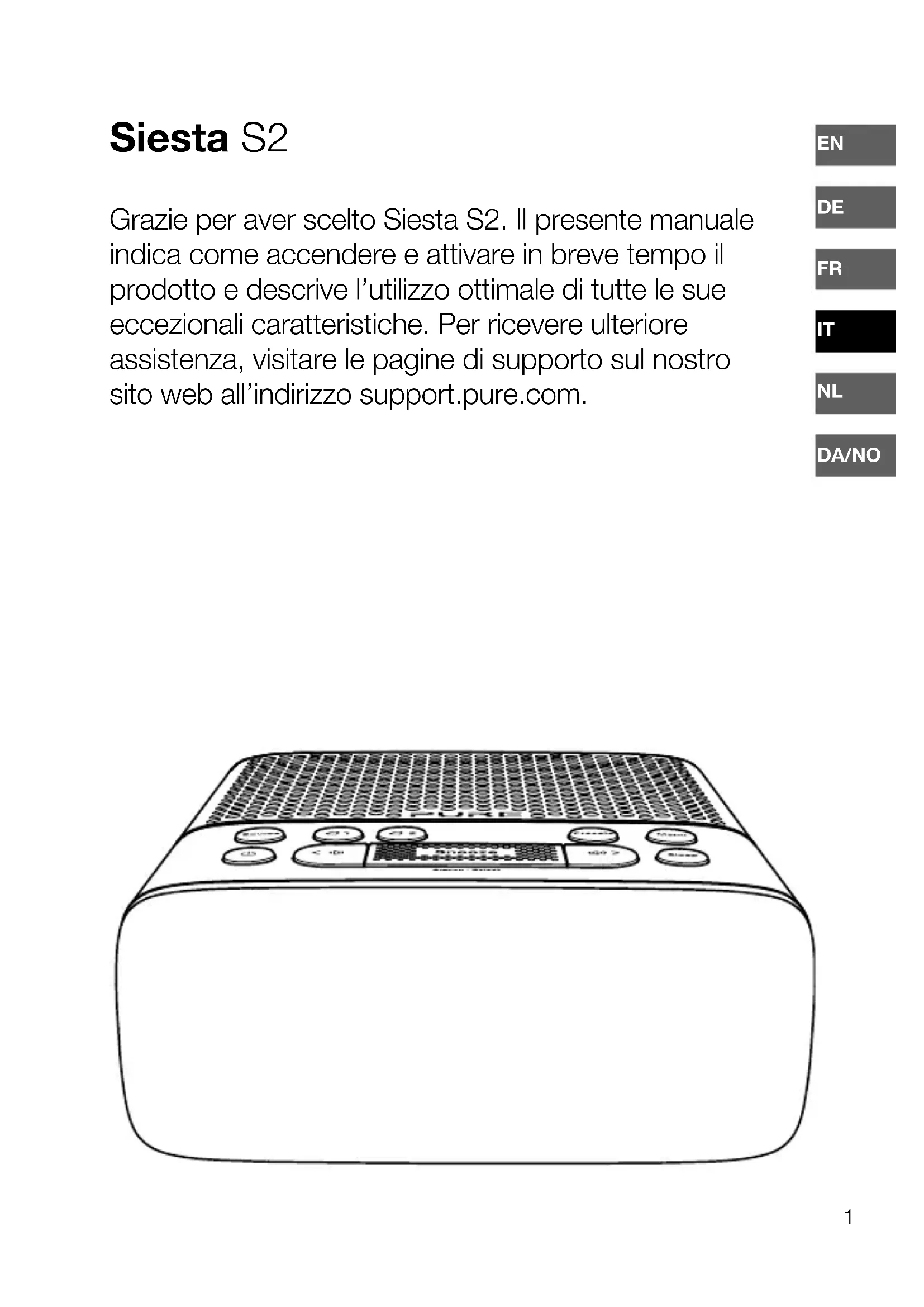 Siesta S2 Grazie per aver scelto Siesta S2. Il presente manuale indica come accendere e attivare in breve tempo il prodotto e descrive l’utilizzo ottimale di tutte le sue eccezionali caratteristiche. Per ricevere ulteriore assistenza, visitare le pagine di supporto sul nostro sito web all’indirizzo support.pure.com.2 Nota: Per informazioni su tutti gli altri simboli utilizzati sul prodotto, scaricare la guida utente di Siesta S2 dal sito support.pure.com.