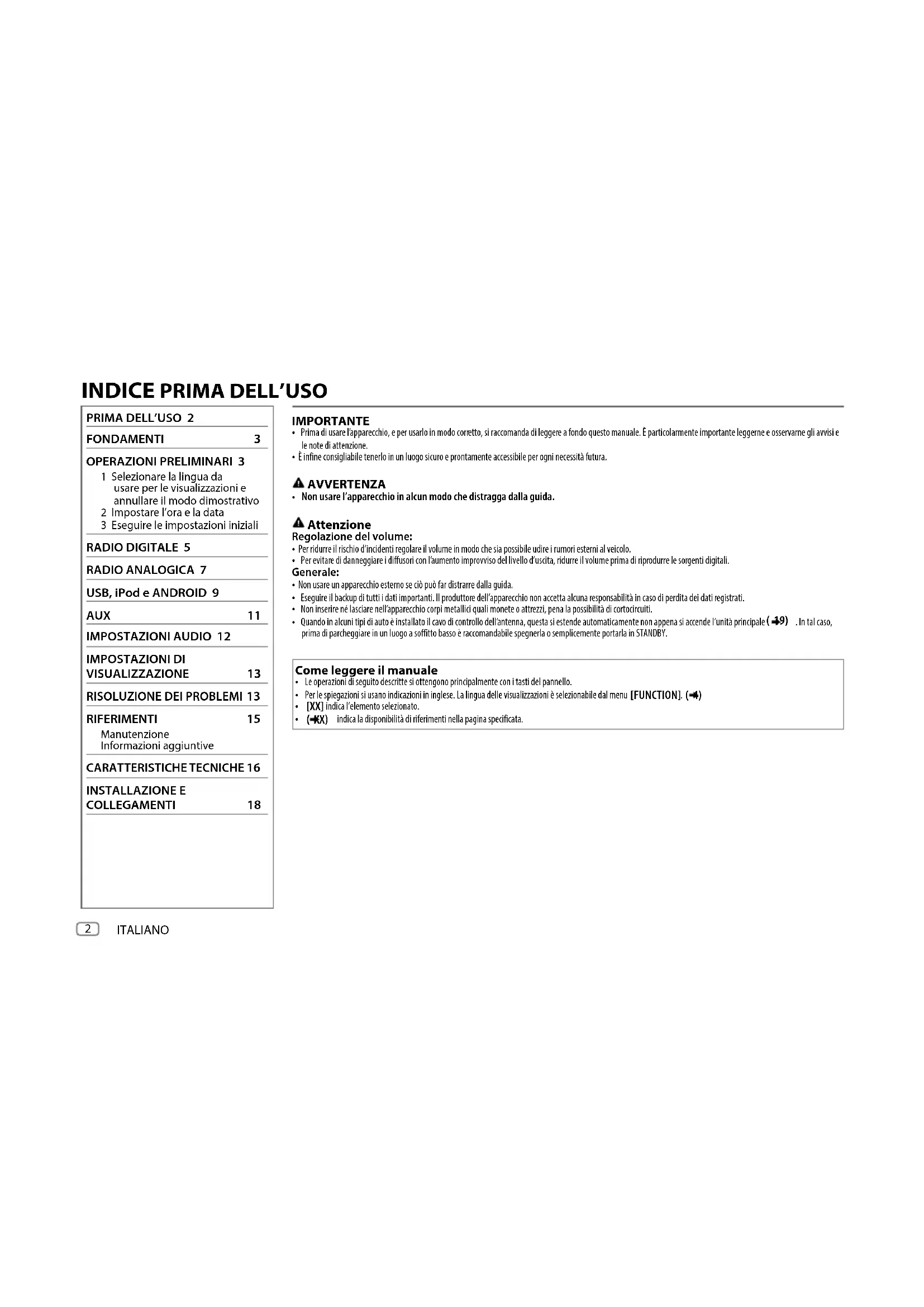 FONDAMENTI 3 OPERAZIONI PRELIMINARI 3 1 Selezionare la lingua da usare per le visualizzazioni e annullare il modo dimostrativo 2 Impostare l’ora e la data 3 Eseguire le impostazioni iniziali RADIO DIGITALE 5 RADIO ANALOGICA 7 USB, iPod e ANDROID 9 AUX 11 IMPOSTAZIONI AUDIO 12 IMPOSTAZIONI DI VISUALIZZAZIONE 13