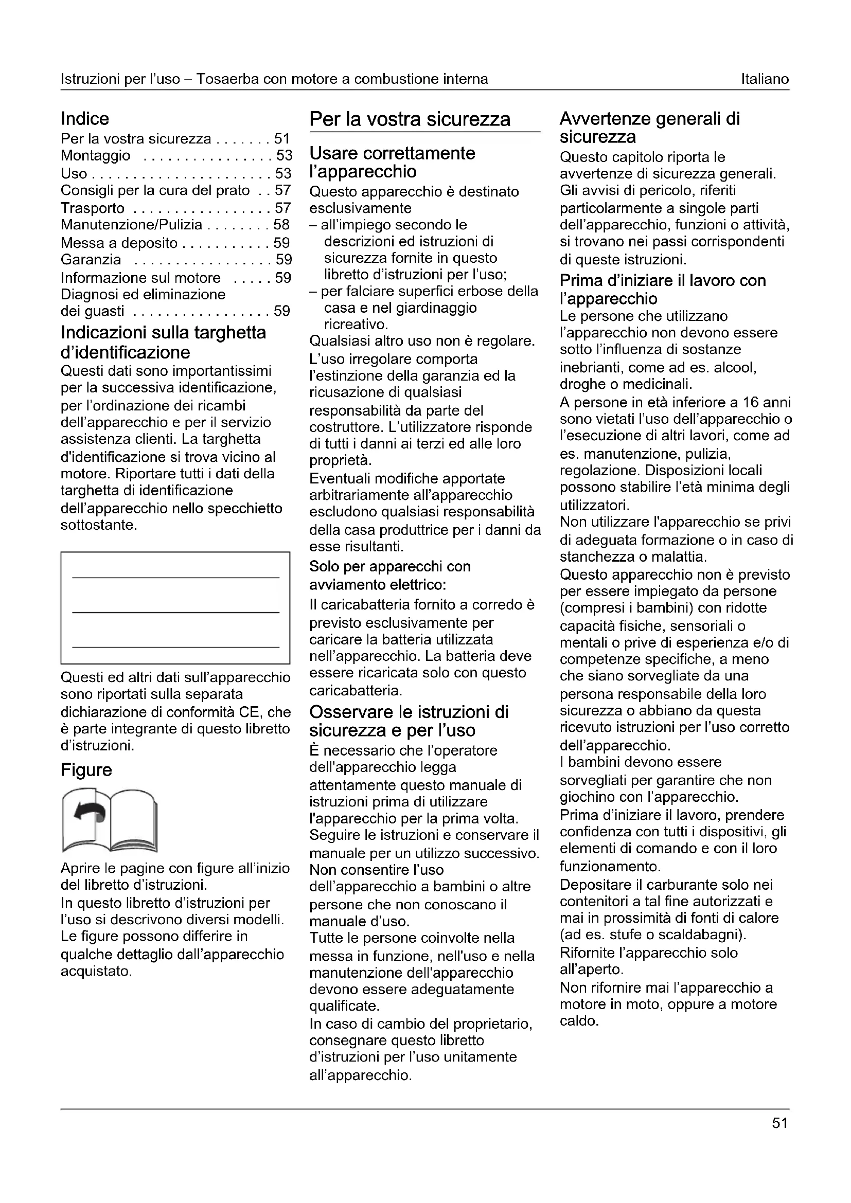 figure possono differire in qualche dettaglio dall’apparecchio acquistato. Per la vostra sicurezza Usare correttamente l’apparecchio Questo apparecchio è destinato esclusivamente – all’impiego secondo le descrizioni ed istruzioni di sicurezza fornite in questo libretto d’istruzioni per l’uso; – per falciare superfici erbose della casa e nel giardinaggio ricreativo. Qualsiasi altro uso non è regolare. L’uso irregolare comporta l’estinzione della garanzia ed la ricusazione di qualsiasi responsabilità da parte del costruttore. L’utilizzatore risponde di tutti i danni ai terzi ed alle loro proprietà. Eventuali modifiche apportate arbitrariamente all’apparecchio escludono qualsiasi responsabilità della casa produttrice per i danni da esse risultanti. Solo per apparecchi con avviamento elettrico: Il caricabatteria fornito a corredo è previsto esclusivamente per caricare la batteria utilizzata nell’apparecchio. La batteria deve essere ricaricata solo con questo caricabatteria. Osservare le istruzioni di sicurezza e per l’uso È necessario che l’operatore dell'apparecchio legga attentamente questo manuale di istruzioni prima di utilizzare l'apparecchio per la prima volta. Seguire le istruzioni e conservare il manuale per un utilizzo successivo. Non consentire l’uso dell’apparecchio a bambini o altre persone che non conoscano il manuale d’uso. Tutte le persone coinvolte nella messa in funzione, nell'uso e nella manutenzione dell'apparecchio devono essere adeguatamente qualificate. In caso di cambio del proprietario, consegnare questo libretto d’istruzioni per l’uso unitamente all’apparecchio. Avvertenze generali di sicurezza Questo capitolo riporta le avvertenze di sicurezza generali. Gli avvisi di pericolo, riferiti particolarmente a singole parti dell’apparecchio, funzioni o attività, si trovano nei passi corrispondenti di queste istruzioni. Prima d’iniziare il lavoro con l’apparecchio Le persone che utilizzano l’apparecchio non devono essere sotto l’influenza di sostanze inebrianti, come ad es. alcool, droghe o medicinali. A persone in età inferiore a 16 anni sono vietati l’uso dell’apparecchio o l’esecuzione di altri lavori, come ad es. manutenzione, pulizia, regolazione. Disposizioni locali possono stabilire l’età minima degli utilizzatori. Non utilizzare l'apparecchio se privi di adeguata formazione o in caso di stanchezza o malattia. Questo apparecchio non è previsto per essere impiegato da persone (compresi i bambini) con ridotte capacità fisiche, sensoriali o mentali o prive di esperienza e/o di competenze specifiche, a meno che siano sorvegliate da una persona responsabile della loro sicurezza o abbiano da questa ricevuto istruzioni per l’uso corretto dell’apparecchio. I bambini devono essere sorvegliati per garantire che non giochino con l’apparecchio. Prima d’iniziare il lavoro, prendere confidenza con tutti i dispositivi, gli elementi di comando e con il loro funzionamento. Depositare il carburante solo nei contenitori a tal fine autorizzati e mai in prossimità di fonti di calore (ad es. stufe o scaldabagni). Rifornite l’apparecchio solo all’aperto. Non rifornire mai l’apparecchio a motore in moto, oppure a motore caldo.Italiano Istruzioni per l’uso – Tosaerba con motore a combustione interna