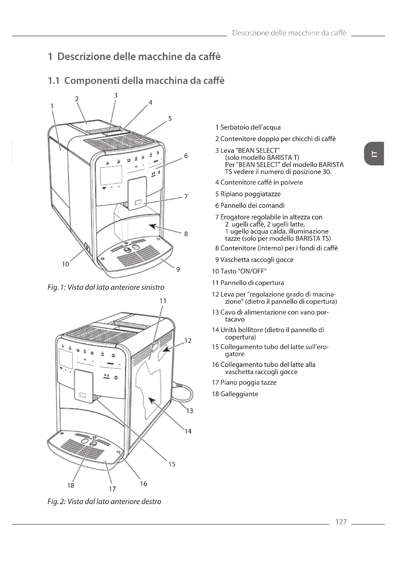 Fig. 2: Vista dal lato anteriore destro 1 Serbatoio dell'acqua 2 Contenitore doppio per chicchi di caè 3 Leva "BEAN SELECT" (solo modello BARISTAT) Per "BEAN SELECT" del modello BARISTA TS vedere il numero di posizione 30. 4 Contenitore caè in polvere 5 Ripiano poggiatazze 6 Pannello dei comandi 7 Erogatore regolabile in altezza con 2 ugelli caè, 2 ugelli latte, 1 ugello acqua calda, illuminazione tazze (solo per modello BARISTATS) 8 Contenitore (interno) per i fondi di caè 9 Vaschetta raccogli gocce 10 Tasto "ON/OFF" 11 Pannello di copertura 12 Leva per "regolazione grado di macina- zione" (dietro il pannello di copertura) 13 Cavo di alimentazione con vano por- tacavo 14 Unità bollitore (dietro il pannello di copertura) 15 Collegamento tubo del latte sull'ero- gatore 16 Collegamento tubo del latte alla vaschetta raccogli gocce 17 Piano poggia tazze 18 GalleggianteDescrizione delle macchine da caè