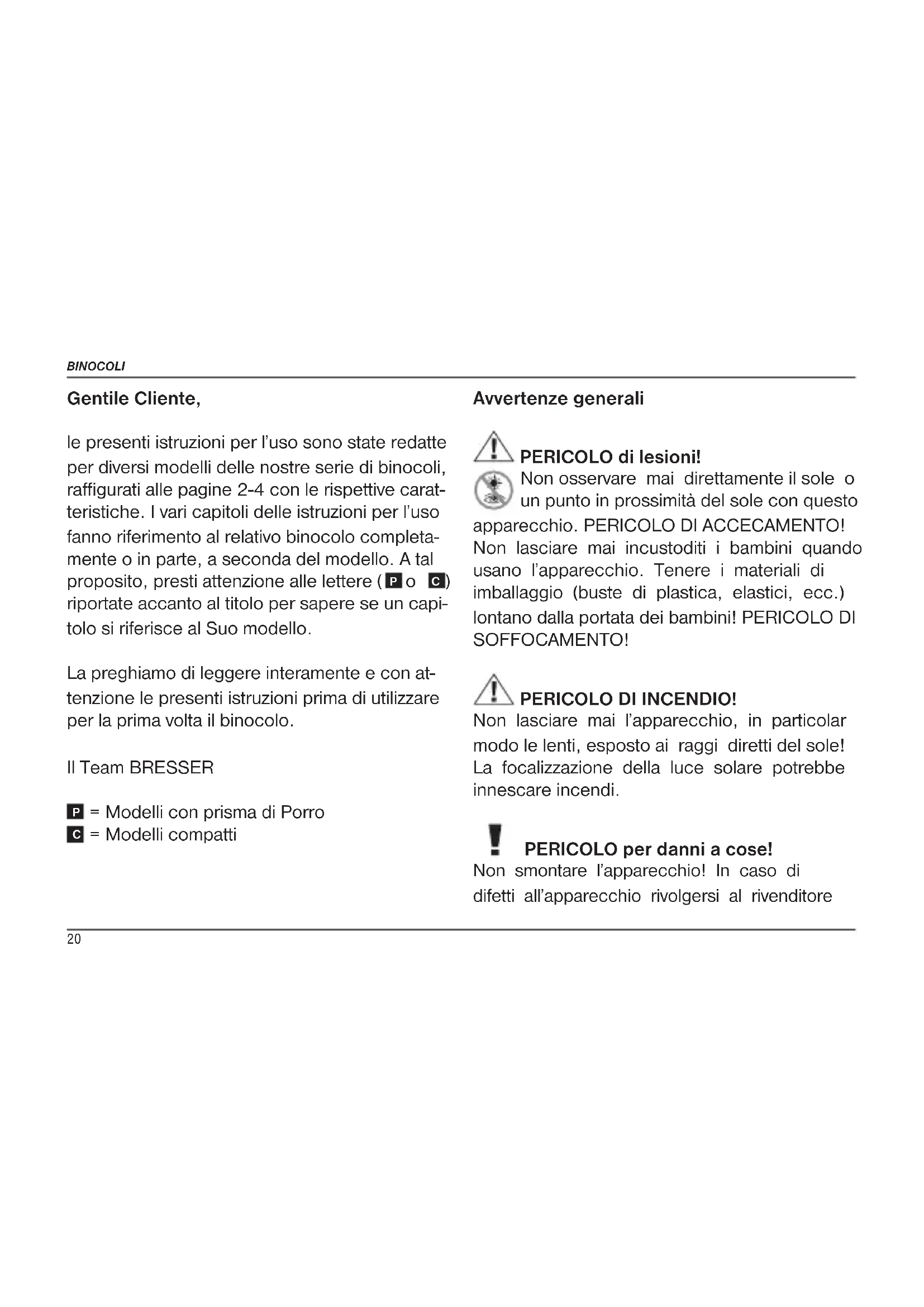 riportate accanto al titolo per sapere se un capi- tolo si riferisce al Suo modello. La preghiamo di leggere interamente e con at- tenzione le presenti istruzioni prima di utilizzare per la prima volta il binocolo. Il Team BRESSER