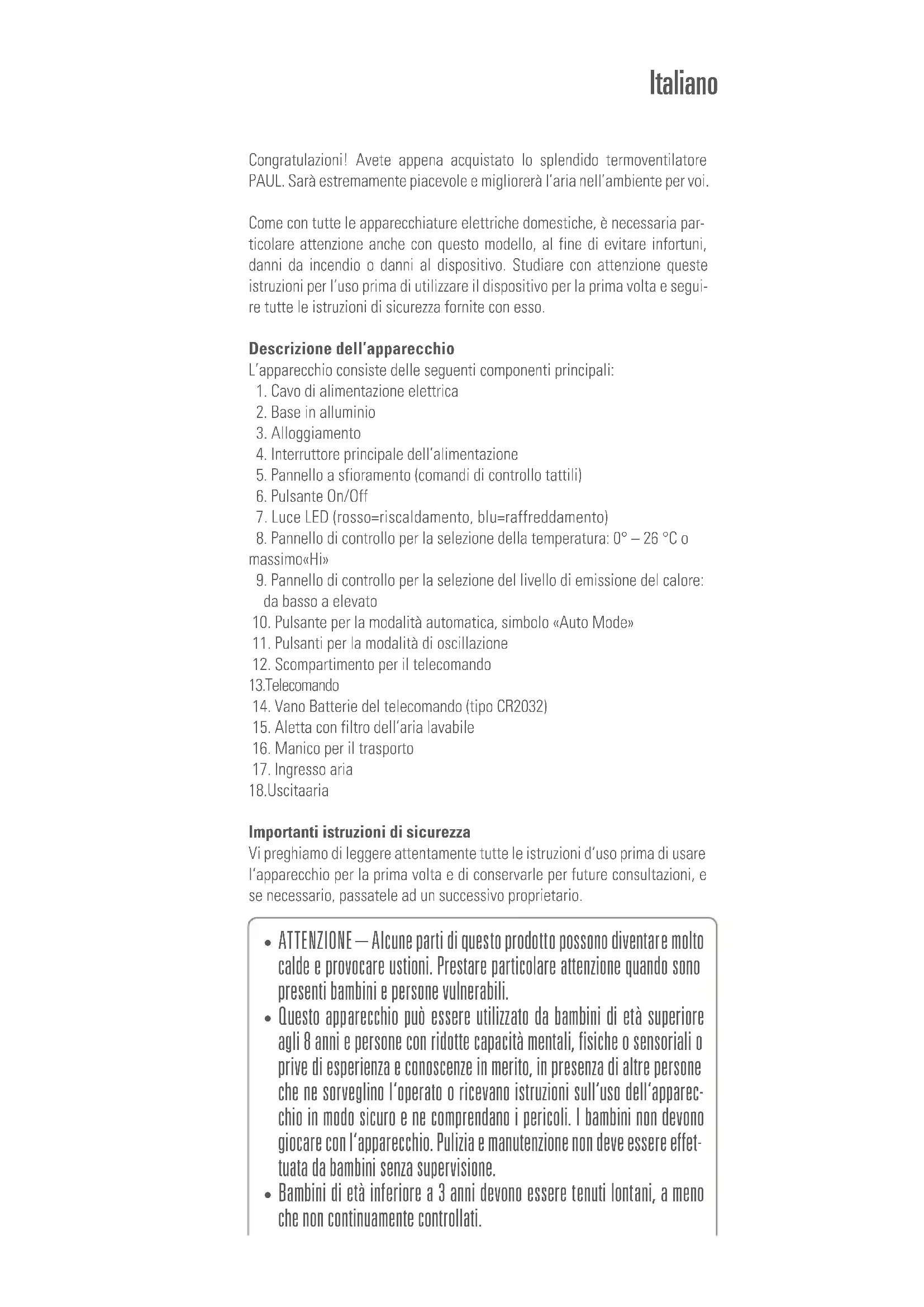 - ATTENZIONE — Alcune parti di quello prodotto possono diventar e molto calde e provocare usioni. Prestare particolare attenzione quando sono presenti bambini e persone vulnerabili.