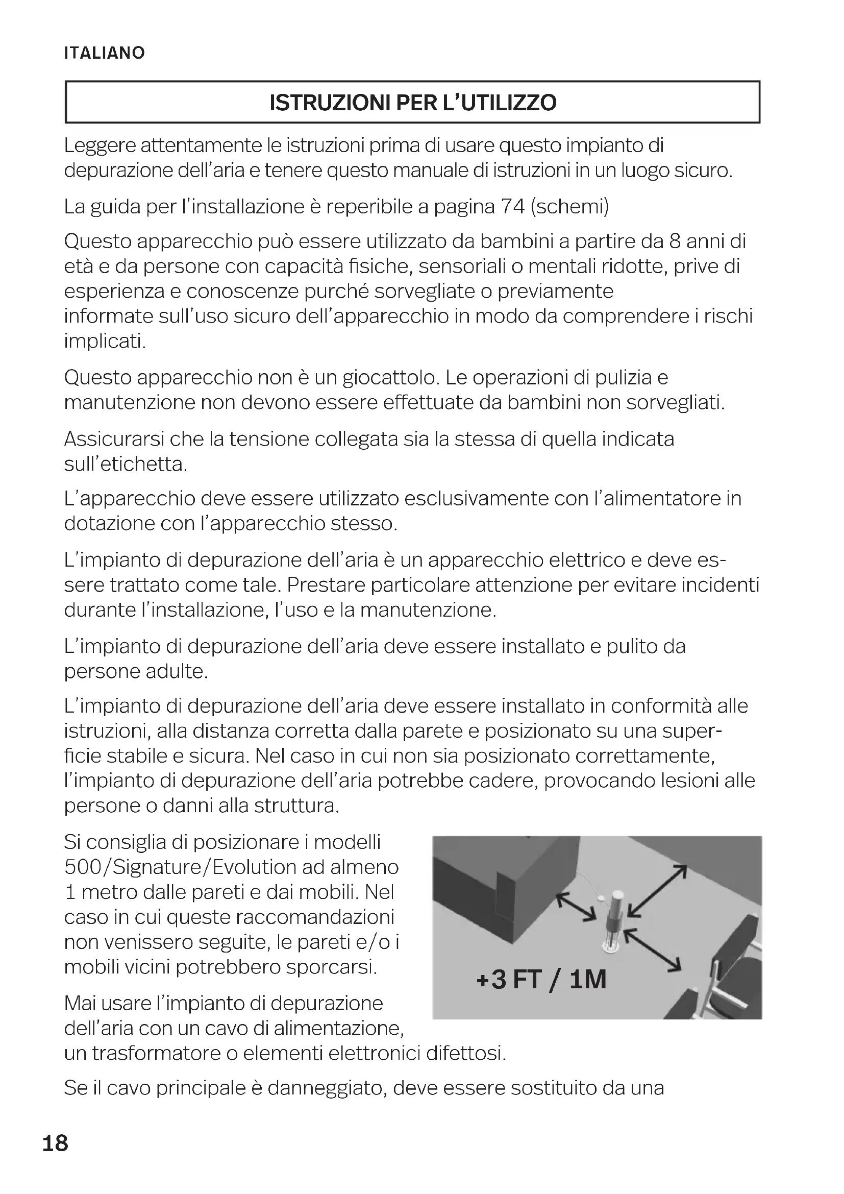 Leggere attentamente le istruzioni prima di usare questo impianto di depurazione dell’aria e tenere questo manuale di istruzioni in un luogo sicuro. La guida per l’installazione è reperibile a pagina 74 (schemi) Questo apparecchio può essere utilizzato da bambini a partire da 8 anni di età e da persone con capacità siche, sensoriali o mentali ridotte, prive di esperienza e conoscenze purché sorvegliate o previamente informate sull’uso sicuro dell’apparecchio in modo da comprendere i rischi implicati. Questo apparecchio non è un giocattolo. Le operazioni di pulizia e manutenzione non devono essere effettuate da bambini non sorvegliati. Assicurarsi che la tensione collegata sia la stessa di quella indicata sull’etichetta. L’apparecchio deve essere utilizzato esclusivamente con l’alimentatore in dotazione con l’apparecchio stesso. L’impianto di depurazione dell’aria è un apparecchio elettrico e deve es- sere trattato come tale. Prestare particolare attenzione per evitare incidenti durante l’installazione, l’uso e la manutenzione. L’impianto di depurazione dell’aria deve essere installato e pulito da persone adulte. L’impianto di depurazione dell’aria deve essere installato in conformità alle istruzioni, alla distanza corretta dalla parete e posizionato su una super- cie stabile e sicura. Nel caso in cui non sia posizionato correttamente, l’impianto di depurazione dell’aria potrebbe cadere, provocando lesioni alle persone o danni alla struttura. Si consiglia di posizionare i modelli 500/Signature/Evolution ad almeno 1 metro dalle pareti e dai mobili. Nel caso in cui queste raccomandazioni non venissero seguite, le pareti e/o i mobili vicini potrebbero sporcarsi. Mai usare l’impianto di depurazione dell’aria con un cavo di alimentazione, un trasformatore o elementi elettronici difettosi. Se il cavo principale è danneggiato, deve essere sostituito da una ITALIANO +3 FT / 1M19 persona qualicata. Per evitare folgorazioni, incendi, lesioni personali o altri pericoli, non immergere l’impianto di depurazione dell’aria, compreso il trasformatore, in acqua o in altri liquidi. Non posizionare l’impianto di depurazione dell’aria o il cavo vicino a una fonte di calore. Non usare l’impianto di puricazione dell’aria all’esterno. Non usare l’impianto di puricazione dell’aria instanze umide. Non usare l’impianto di depurazione dell’aria unitamente a candele colorate o a base di olio, poiché queste emettono fuliggine che può attaccarsi alle pareti e ai mobili. Nel toccare il collettore, potrebbe essere emessa una piccola scarica elettrica innoqua. Se si desidera eliminare la scarica, scollegare ilc- dispositivo prima di manipolarlo e utilizzare la protezione quando il depura- tore è acceso. La protezione è opzionale e non necessaria dal punto di vista della sicurezza. Nota: LifeAir non può essere ritenuta responsabile per eventuali danni causati come conseguenza del mancato rispetto di queste raccoman- dazioni. ITALIANO20 ITALIANO È NECESSARIO scollegare l’alimentazione e s pegnere l’impianto di depurazione dell’aria prima della pulizia. NON lavare il collettore in lavastoviglie. NON usare prodotti detergenti che contengano soluzioni a base di alcol, ammoniaca o sostan- ze alcaline, poiché questi prodotti potrebbero danneggiare l’impianto di depurazione. Il collettore deve essere pulito all’incirca ogni due settimane o quando necessario. Potrebbe essere necessario pulire il collettore più frequentemente se esso viene utilizzato in ambienti altamente contaminati. Pulizia del collettore: