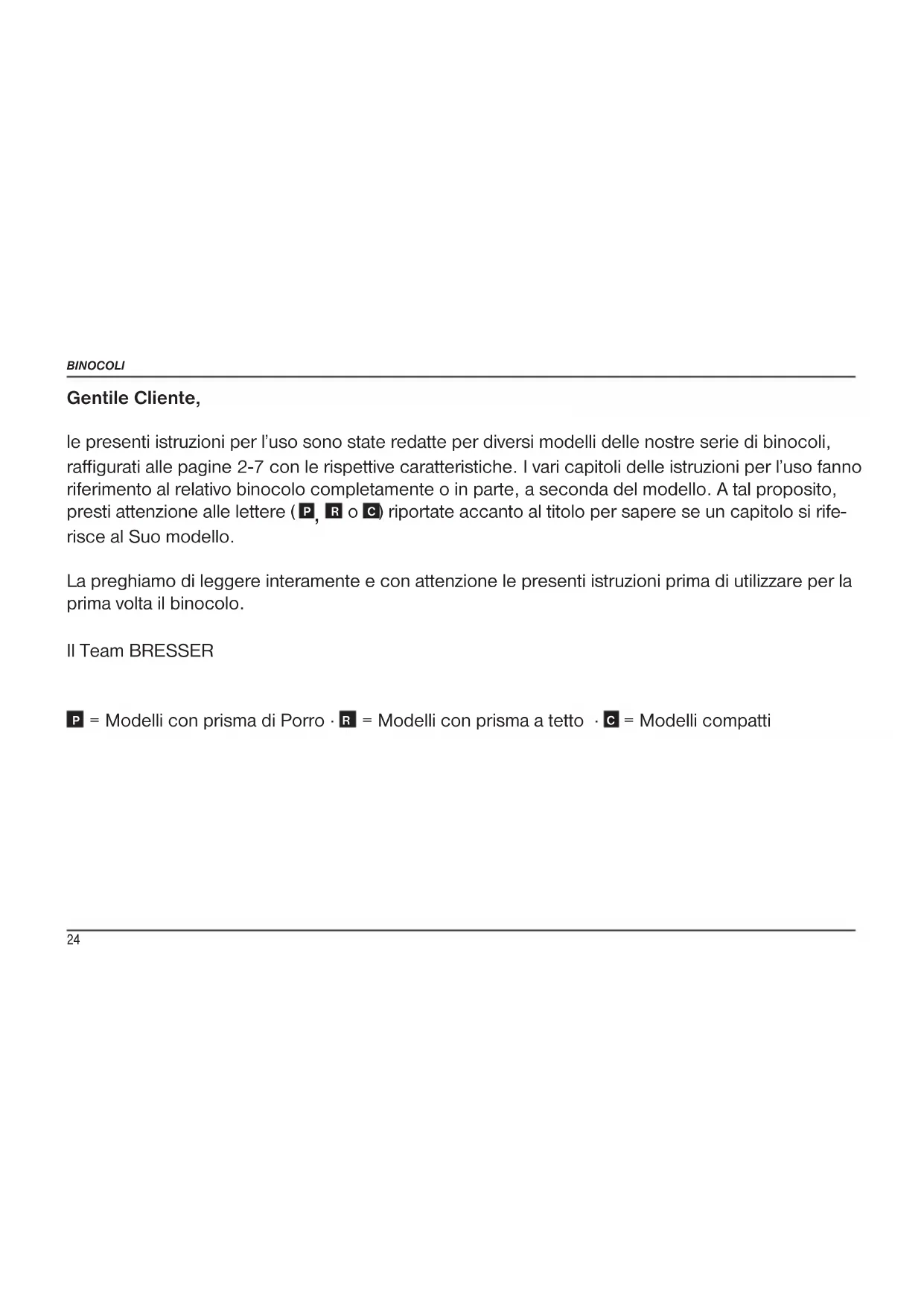 ) riportate accanto al titolo per sapere se un capitolo si rife- risce al Suo modello. La preghiamo di leggere interamente e con attenzione le presenti istruzioni prima di utilizzare per la prima volta il binocolo. Il Team BRESSER