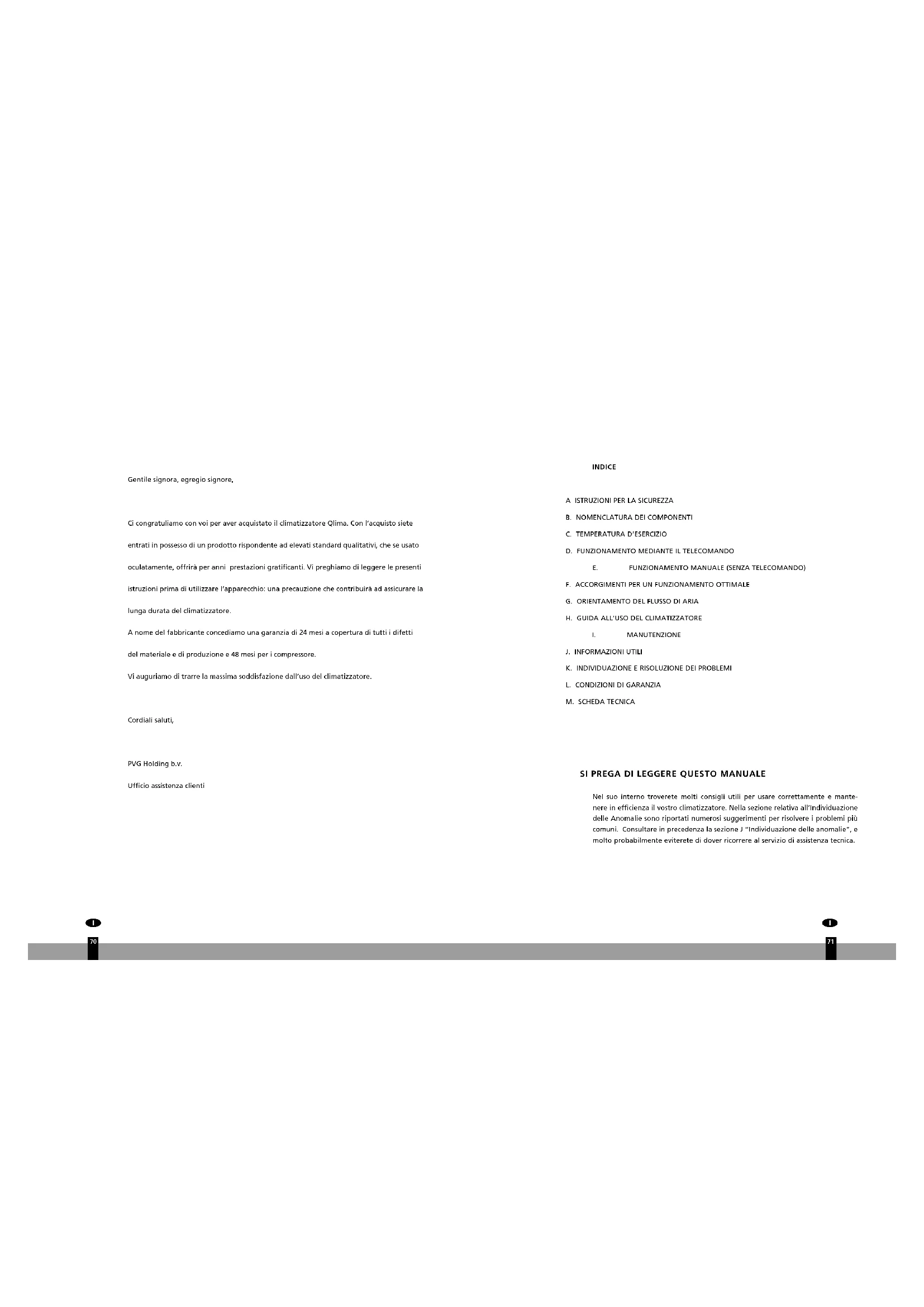 Nel suo interno troverete molti consigli utili per usare correttamente e mante- nere in efficienza il vostro climatizzatore. Nella sezione relativa all’Individuazione delle Anomalie sono riportati numerosi suggerimenti per risolvere i problemi più comuni. Consultare in precedenza la sezione J “Individuazione delle anomalie”, e molto probabilmente eviterete di dover ricorrere al servizio di assistenza tecnica. Gentile signora, egregio signore, Ci congratuliamo con voi per aver acquistato il climatizzatore Qlima. Con l’acquisto siete entrati in possesso di un prodotto rispondente ad elevati standard qualitativi, che se usato oculatamente, offrirà per anni prestazioni gratificanti. Vi preghiamo di leggere le presenti istruzioni prima di utilizzare l’apparecchio: una precauzione che contribuirà ad assicurare la lunga durata del climatizzatore. A nome del fabbricante concediamo una garanzia di 24 mesi a copertura di tutti i difetti del materiale e di produzione e 48 mesi per i compressore. Vi auguriamo di trarre la massima soddisfazione dall’uso del climatizzatore. Cordiali saluti, PVG Holding b.v. Ufficio assistenza clienti
