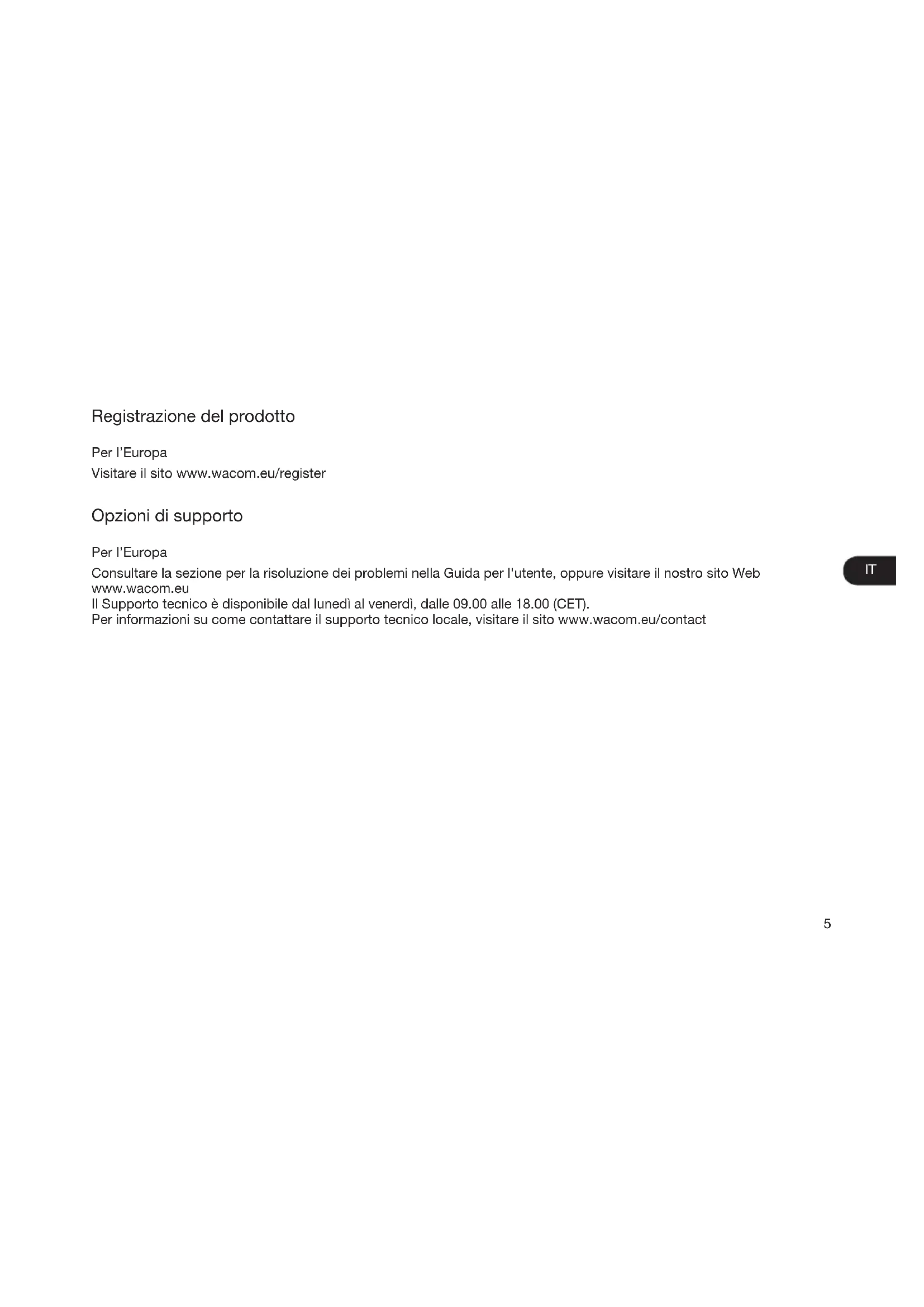 Registrazione del prodotto Per l’Europa Visitare il sito www.wacom.eu/register Opzioni di supporto Per l’Europa Consultare la sezione per la risoluzione dei problemi nella Guida per l'utente, oppure visitare il nostro sito Web www.wacom.eu Il Supporto tecnico è disponibile dal lunedì al venerdì, dalle 09.00 alle 18.00 (CET). Per informazioni su come contattare il supporto tecnico locale, visitare il sito www.wacom.eu/contactIT
