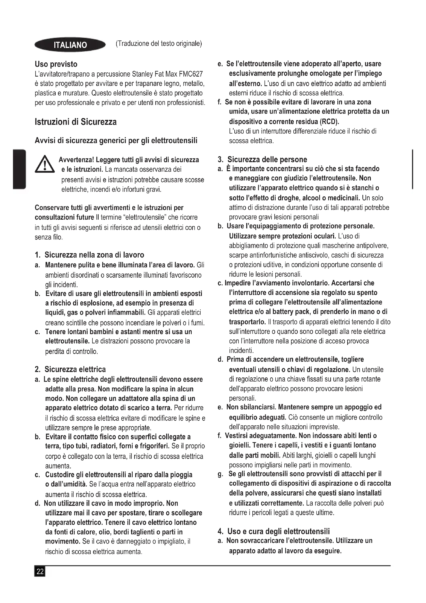 (Traduzione del testo originale) ITALIANO Uso previsto L’avvitatore/trapano a percussione Stanley Fat Max FMC627 è stato progettato per avvitare e per trapanare legno, metallo, plastica e murature. Questo elettroutensile è stato progettato per uso professionale e privato e per utenti non professionisti. Istruzioni di Sicurezza Avvisi di sicurezza generici per gli elettroutensili