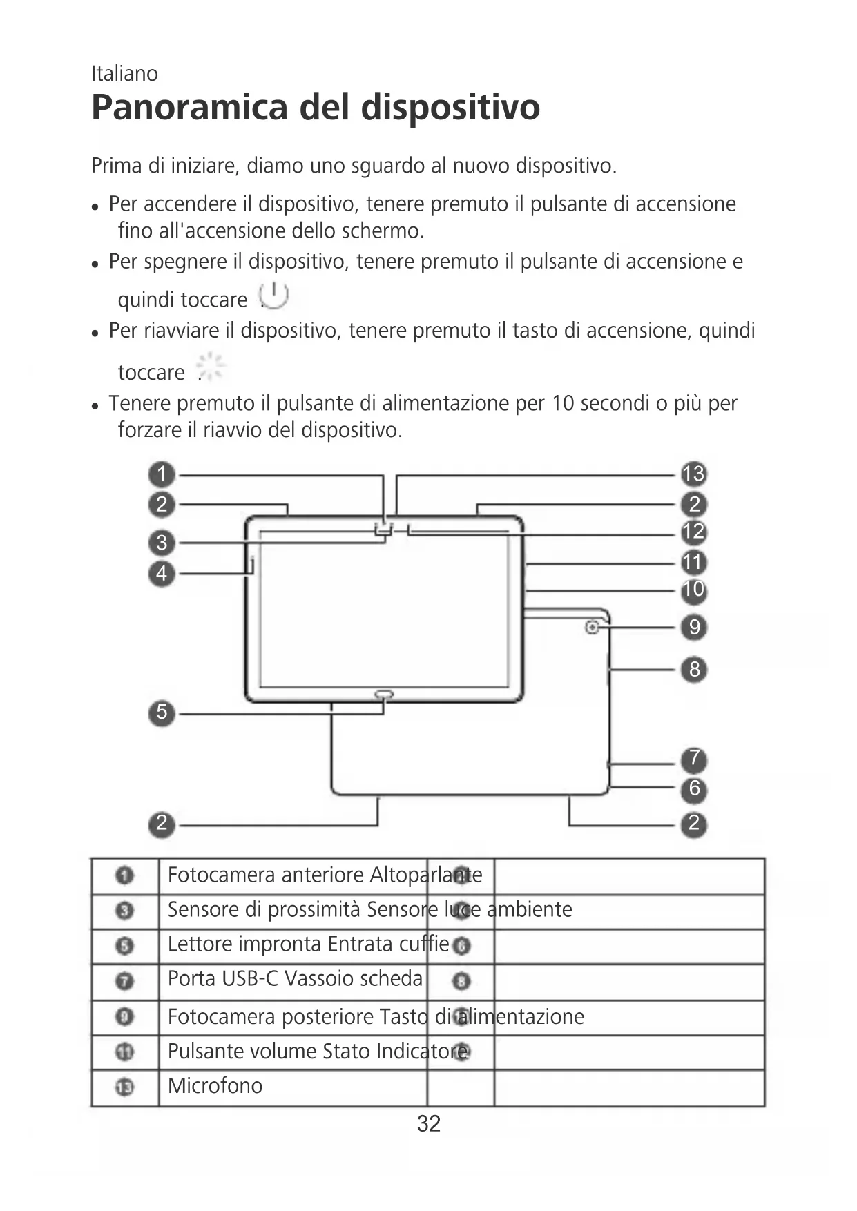 33Per ulteriori informazioni Se si riscontrano problemi durante l'utilizzo del dispositivo, è possibile ricevere assistenza da parte delle seguenti risorse: l Accedi a Suggerimenti per dettagli sulla funzione e consigli di utilizzo. l Visitare http://consumer.huawei.com/en per accedere alle info del dispositivo, le domande frequenti e altri dettagli. l Visitare http://consumer.huawei.com/en/support per le informazioni di contatto del Paese o della regione più aggiornate. l Puoi trovare il servizio assistenza, gli indirizzi dei rivenditori, i regolamenti di servizio e ulteriori informazioni per la tua area in HiCare. Accedere a Impostazioni e toccare Sistema > Informazioni sul tablet > Informazioni legali per visualizzare le informazioni legali del prodotto. Accedere a Impostazioni e toccare Sistema > Informazioni sul tablet > Informazioni legali > Informazioni sulla sicurezza per visualizzare le informazioni di sicurezza del prodotto. Accedere a Impostazioni e toccare Sistema > Informazioni sul tablet > Info autenticazione per visualizzare le informazioni sulle normative del prodotto. Accedere a Impostazioni e toccare Sistema > Logo certicato per visualizzare le informazioni sui loghi delle certicazioni del prodotto. Le gure e le illustrazioni in questa guida, inclusi ma non limitati ad essi, il colore, le dimensioni ed il contenuto visualizzato sono solo a scopo di riferimento. Il dispositivo vero e proprio potrebbe variare. Nulla di questa guida costituisce garanzia di alcun tipo, esplicita o implicita. 34Informazioni sulla sicurezza Leggere attentamente tutte le informazioni di sicurezza prima di utilizzare il dispositivo per assicurare il funzionamento sicuro e corretto e per lo smaltimento secondo le regole previste. Procedure e sicurezza l Per evitare eventuali danni all'udito, evitare l’ascolto ad un volume troppo elevato e per periodi prolungati. l L'utilizzo di un alimentatore, caricabatterie o batteria non approvati o incompatibili, potrebbero danneggiare il dispositivo, ridurre la durata o provocare incendi, esplosioni o altri pericoli. l Le temperature di utilizzo ideali vanno da 0 °C a 35 °C. Temperature di conservazione ideali vanno da -20 °C a +45 °C. l I produttori di pacemaker consigliano di mantenere una distanza minima di 15 cm tra il dispositivo e il pacemaker per evitare interferenze. I portatori di pacemaker devono utilizzare l'orecchio sul lato opposto rispetto al pacemaker durante le conversazioni e non riporre mai il dispositivo nel taschino sul petto. l Tenere il dispositivo lontano da fonti di calore eccessivo e non esporlo alla luce diretta del sole. Non posizionarlo su o in dispositivi di riscaldamento, quali forni a microonde, stufe o radiatori. l Rispettare le norme e i regolamenti locali durante l'uso del dispositivo. Per ridurre il rischio di incidenti, non utilizzare il dispositivo wireless durante la guida. l Durante il volo in aereo o immediatamente prima dell'imbarco, utilizzare il dispositivo secondo le istruzioni fornite. L'uso di dispositivi wireless in aereo può interferire con le reti wireless, costituire pericolo per le operazioni di volo e in altri casi, essere proibito dalla legge. l Per evitare danni a parti del dispositivo o circuiti interni, non utilizzarlo in ambienti polverosi, umidi o sporchi, esposti al fumo o vicino a campi magnetici. 35l Durante la fase di carica, accertarsi che l'alimentatore sia inserito in una presa di corrente vicina ai dispositivi e facilmente raggiungibile. l Quando non in uso, scollegare il caricabatteria dalla presa di corrente e dal dispositivo. l Non utilizzare, conservare o trasportare il dispositivo in ambienti in cui sono presenti prodotti inammabili o esplosivi quali, ad esempio, le stazioni di rifornimento, i depositi petroliferi o gli stabilimenti chimici. L'uso del dispositivo in questi ambienti aumenta il rischio di esplosione o incendi. l Smaltire questo dispositivo, la batteria e gli accessori secondo le normative locali. Non devono essere smaltiti come normali riuti domestici. L'uso improprio della batteria potrebbe causare un incendio, un'esplosione o altri eventi pericolosi. l Consultare il proprio medico e il produttore del dispositivo per stabilire se l'utilizzo del dispositivo può interferire con il funzionamento di eventuali dispositivi medici. l Seguire le disposizioni e le norme stabilite dalle strutture ospedaliere e sanitarie. Non usare il dispositivo quando ciò è vietato. l Prima di effettuare o rispondere a una telefonata alla guida, prima accostare e parcheggiare l'auto in tutta sicurezza. l Conservare il dispositivo lontano da fonti di calore e da amme, quali termosifoni, forni a microonde, stufe, scaldabagni, camini o candele. Ambiente a rischio di esplosione Spegnere sempre il dispositivo nelle aree a rischio di esplosione e attenersi scrupolosamente a tutti i segnali e le istruzioni. Le aree a rischio di esplosione comprendono quelle in cui si raccomanda generalmente di spegnere il motore dell'auto. L'emissione di scintille in tali aree potrebbe provocare deagrazioni o incendi, con conseguenti lesioni siche anche mortali. Non accendere il dispositivo nelle aree di rifornimento carburante, come le stazioni di servizio. Attenersi alle restrizioni sull'uso delle apparecchiature radio nelle aree di deposito, stoccaggio e distribuzione di carburante e negli impianti chimici. Inoltre, osservare le restrizioni applicabili all'interno delle aree in cui sono utilizzati esplosivi. Prima di utilizzare il dispositivo, accertarsi di non trovarsi in vicinanze di aree a rischio di esplosione. In genere, ma non sempre, queste aree sono segnalate chiaramente. Alcuni esempi sono la sottocoperta delle navi, le 36strutture per lo stoccaggio o il trasferimento di sostanze chimiche e le aree in cui vi sono sostanze o particelle chimiche disperse nell'atmosfera, come pulviscolo e polveri metalliche. Prima di utilizzare il dispositivo in prossimità di un veicolo GPL, chiedere informazioni al